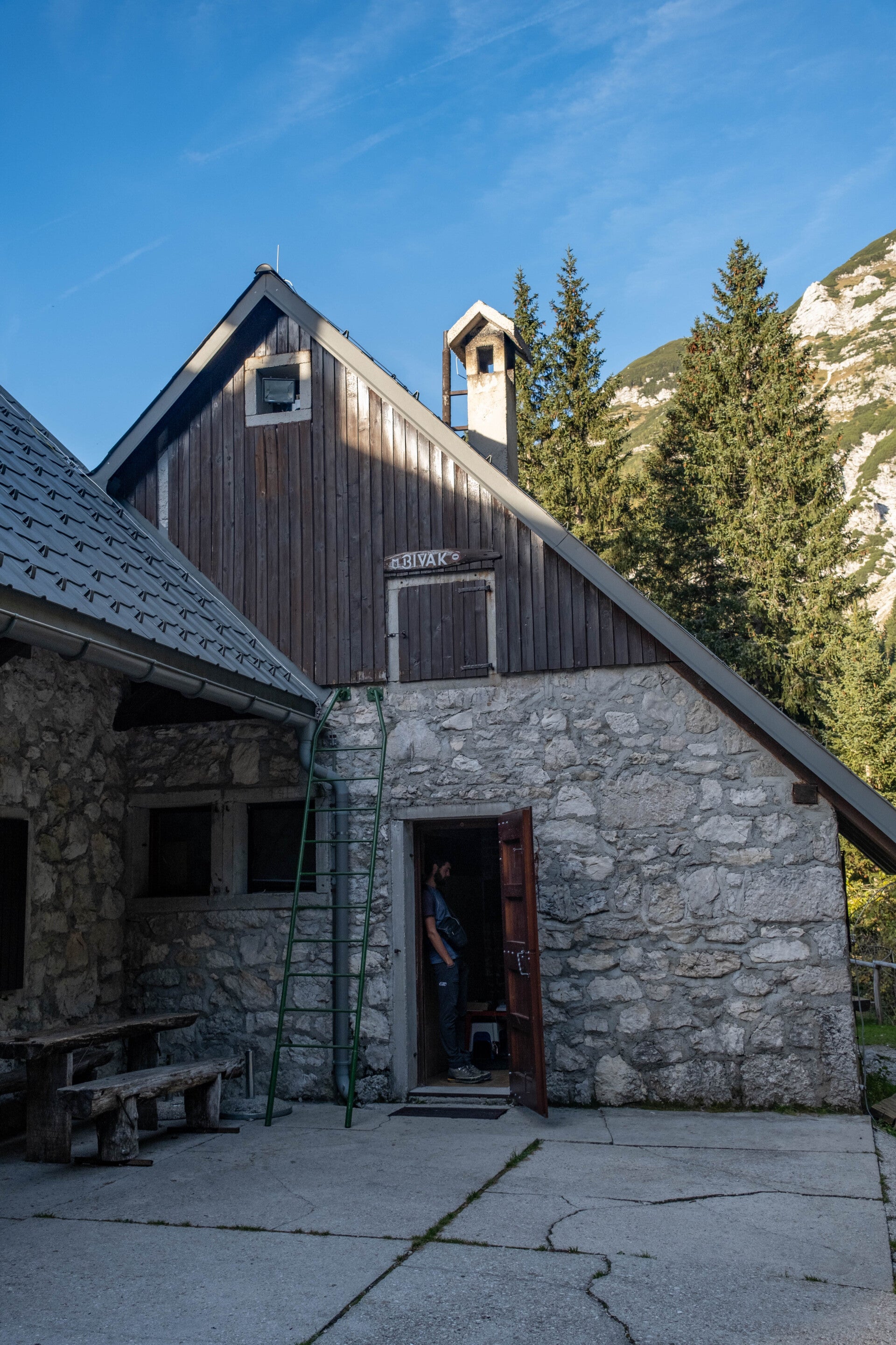 Nous prions pour que le temps soit clément à notre réveil. Nous avons un dernier objectif avant de descendre vers Ljubljana : passer une nuit dans le Bivak Pod Skuto. Un bivouac moderne installé au pied du Skuta où de grandes baies vitrées permettent de contempler les alentours depuis l'intérieur de l'installation. C'était d'ailleurs l'une des raisons majeures du rallongement de l'itinéraire en Slovénie.