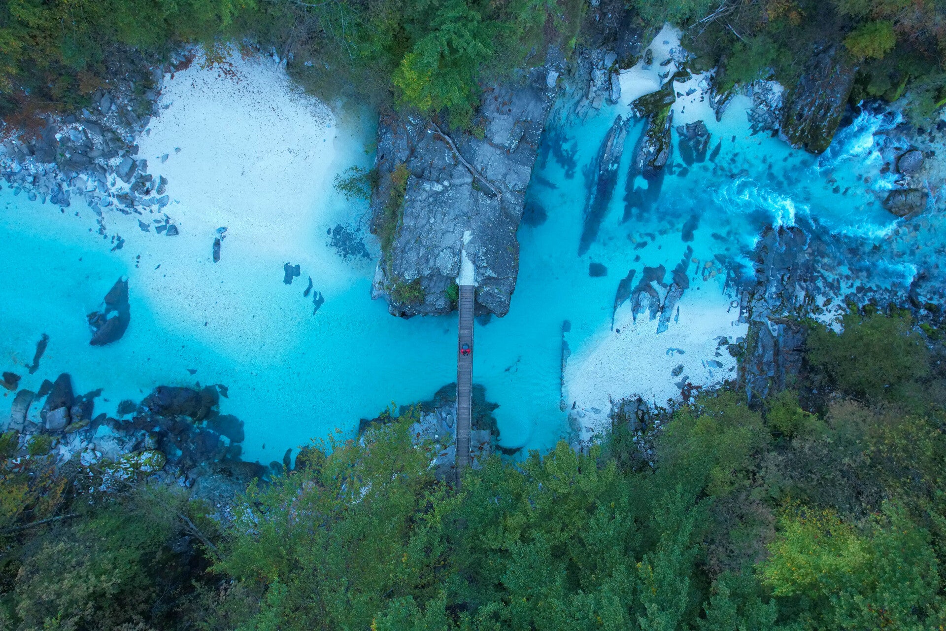 Nous quittons donc la ville de Bovec au petit matin. Les champs de la vallée sont pétrifiés par les gelées matinales et notre respiration émet une bonne dose de condensation, signe d'une certaine fraîcheur en cette première matinée slovène. Fraicheur que nous garderons quelques instants puisque nous n'entamerons la montée au dessus de la vallée de Bovec qu'une fois que nous aurons traversé une des plus belles rivières de Slovénie : la Soča.