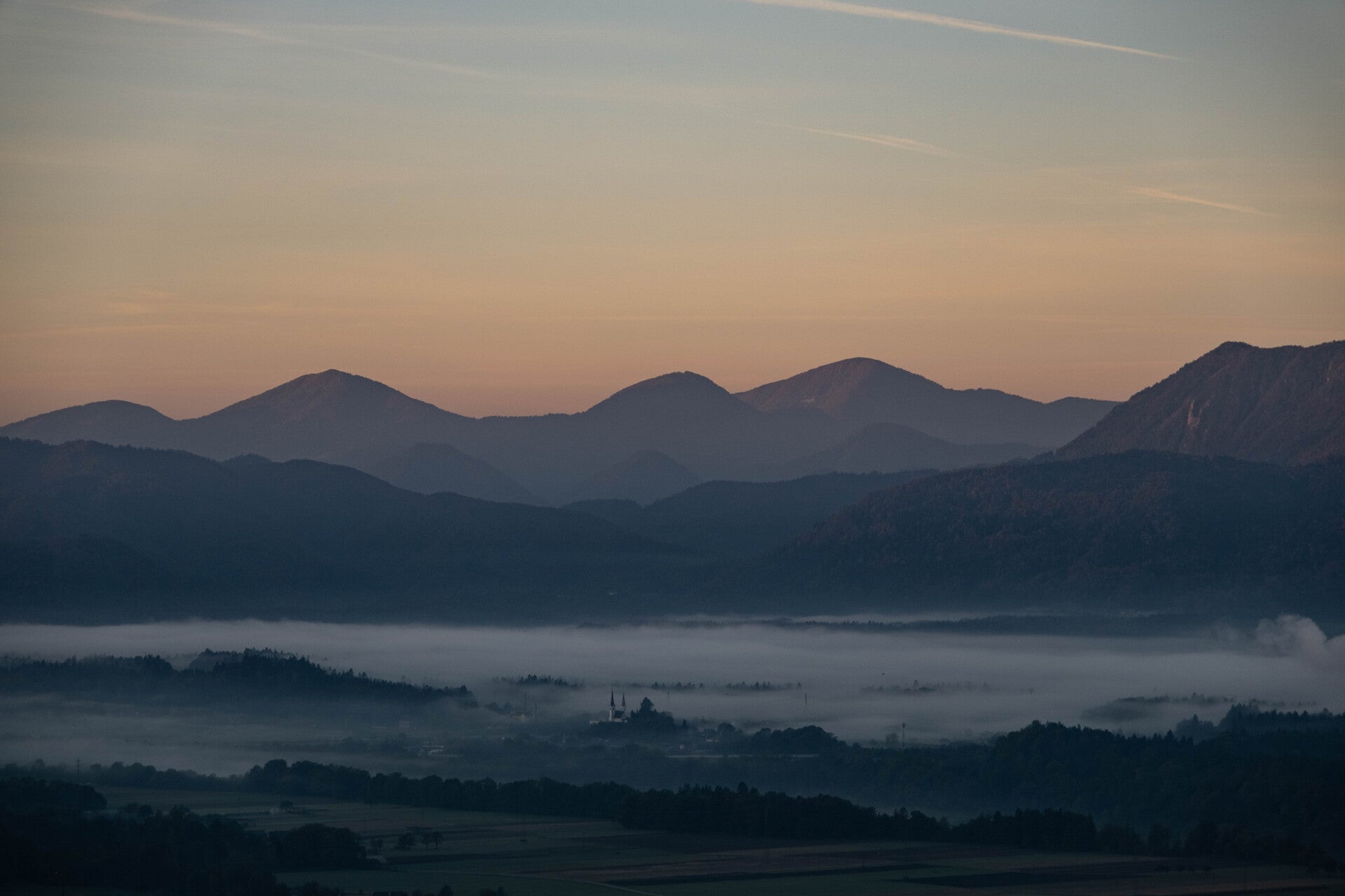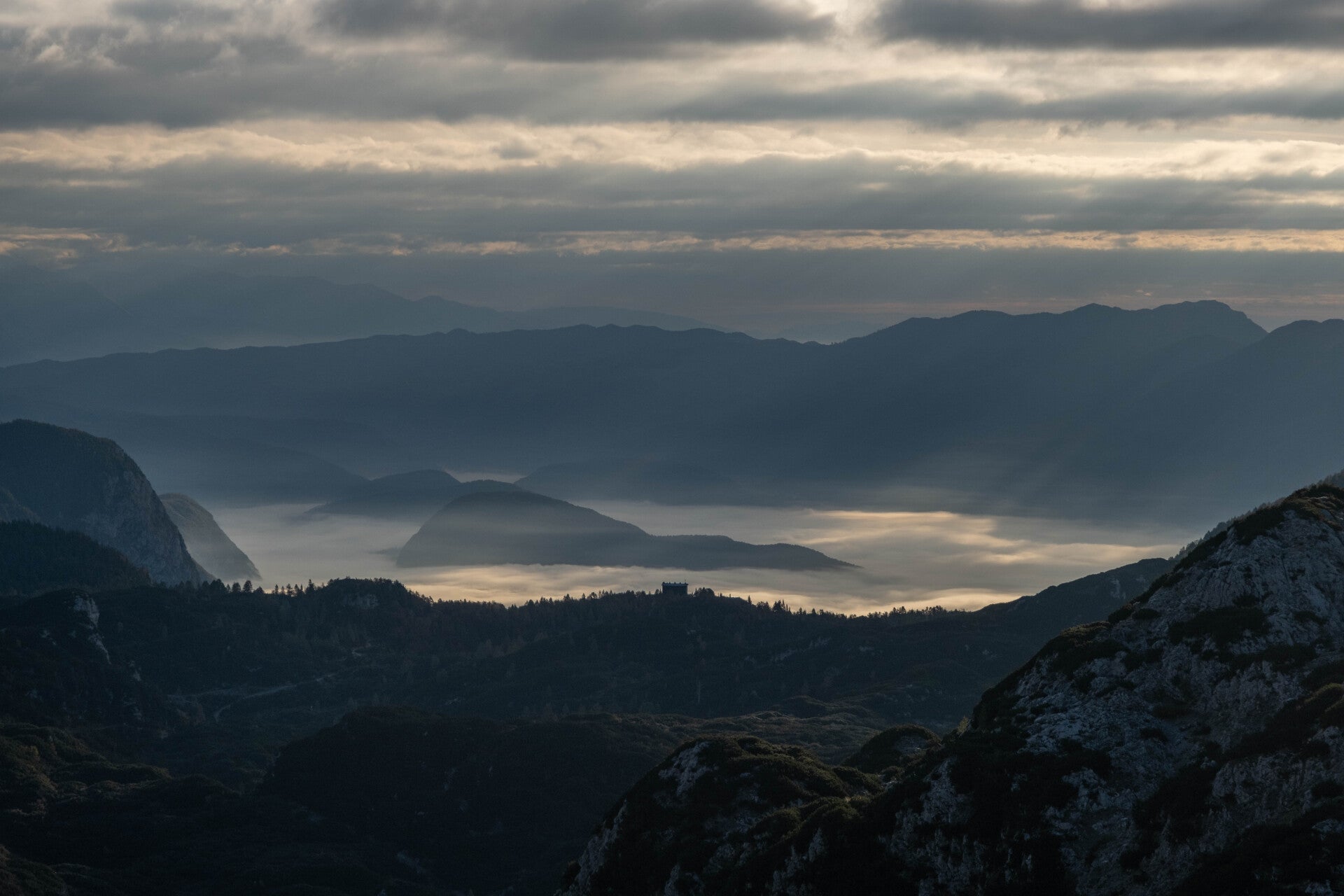 À la nuit tombée, une mer de nuages s'est formée à une vitesse éclair recouvrant la Vallée de Bled mais laissant dépasser notre bivouac et les massifs du coin. Les étoiles pétillent au-dessus de la Slovénie.