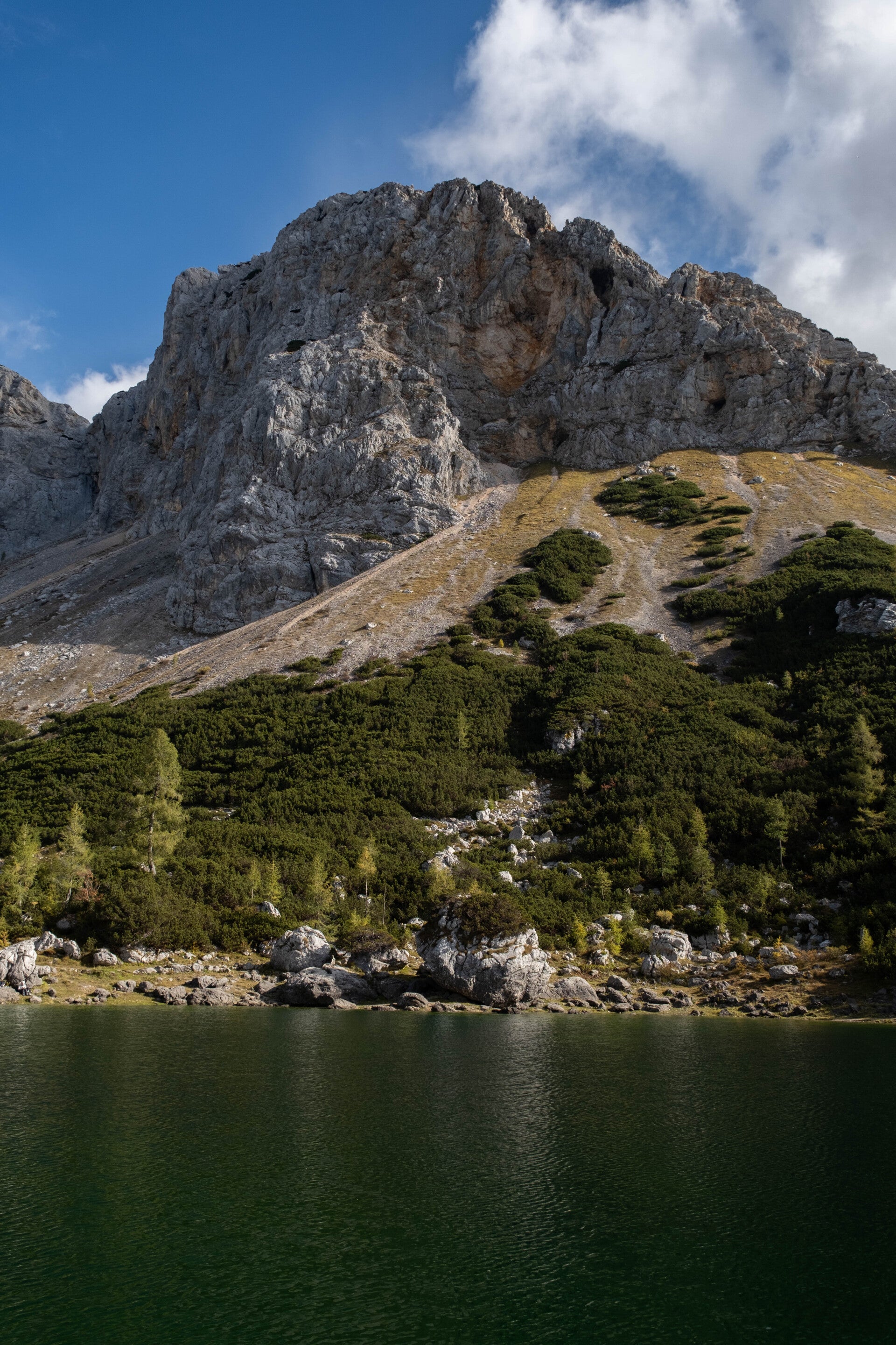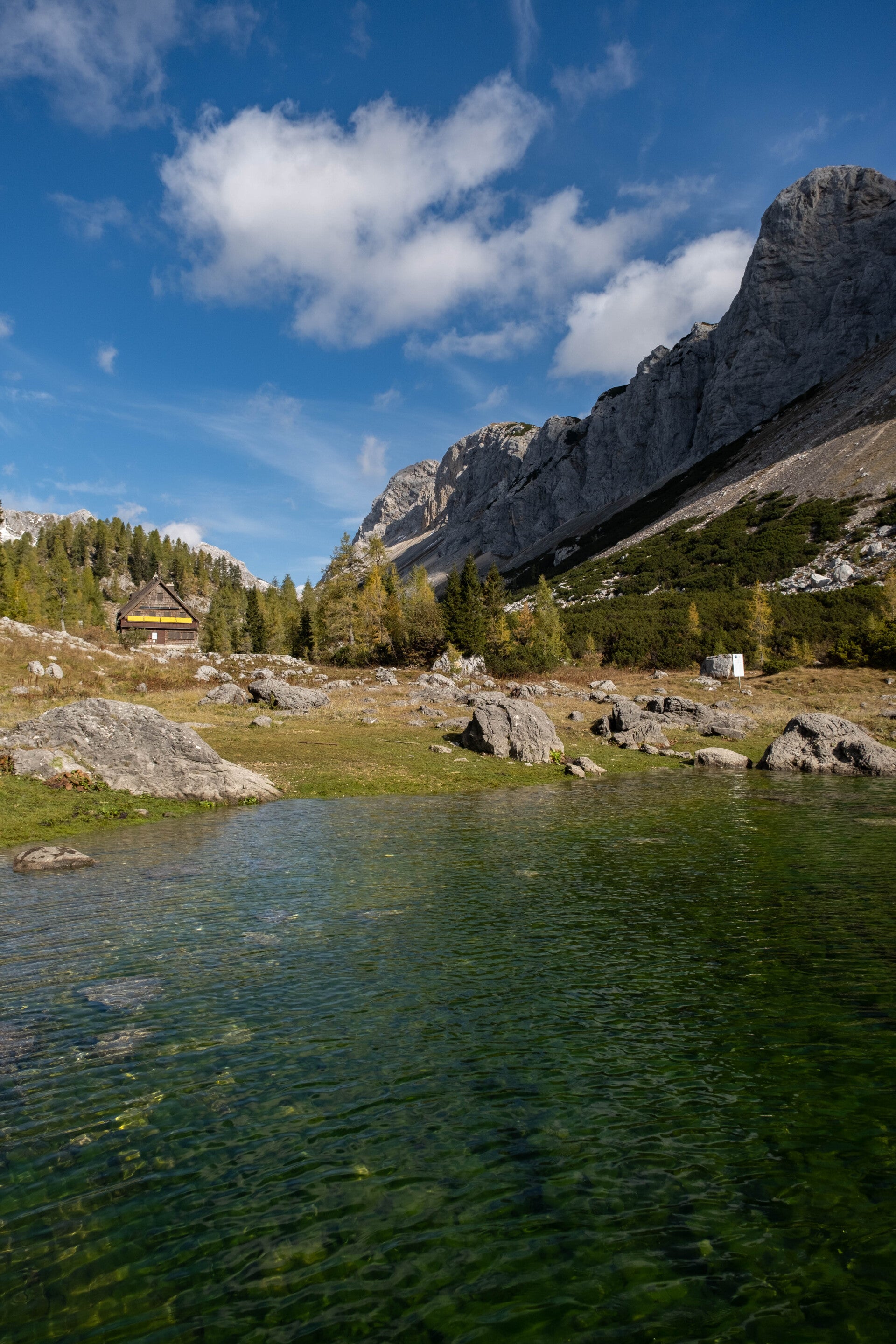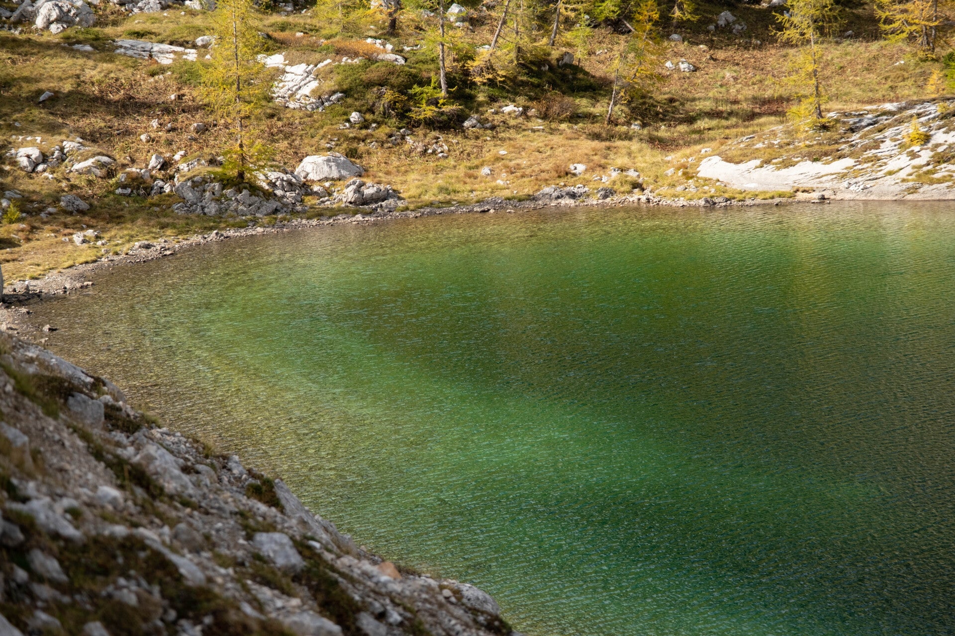 Au milieu des mélèzes jaunes, un vert pétillant fait son apparition. Le Dvojno Jezero est le premier lac de la Vallée des sept lacs. On reprend pied sur la Via Alpina rouge qu'on avait quitté lors de notre échappée des Alpes Carniques. Nous retrouvons également la précieuse eau, verte certes, mais tant pis. C'est goulûment que nous la boirons.
