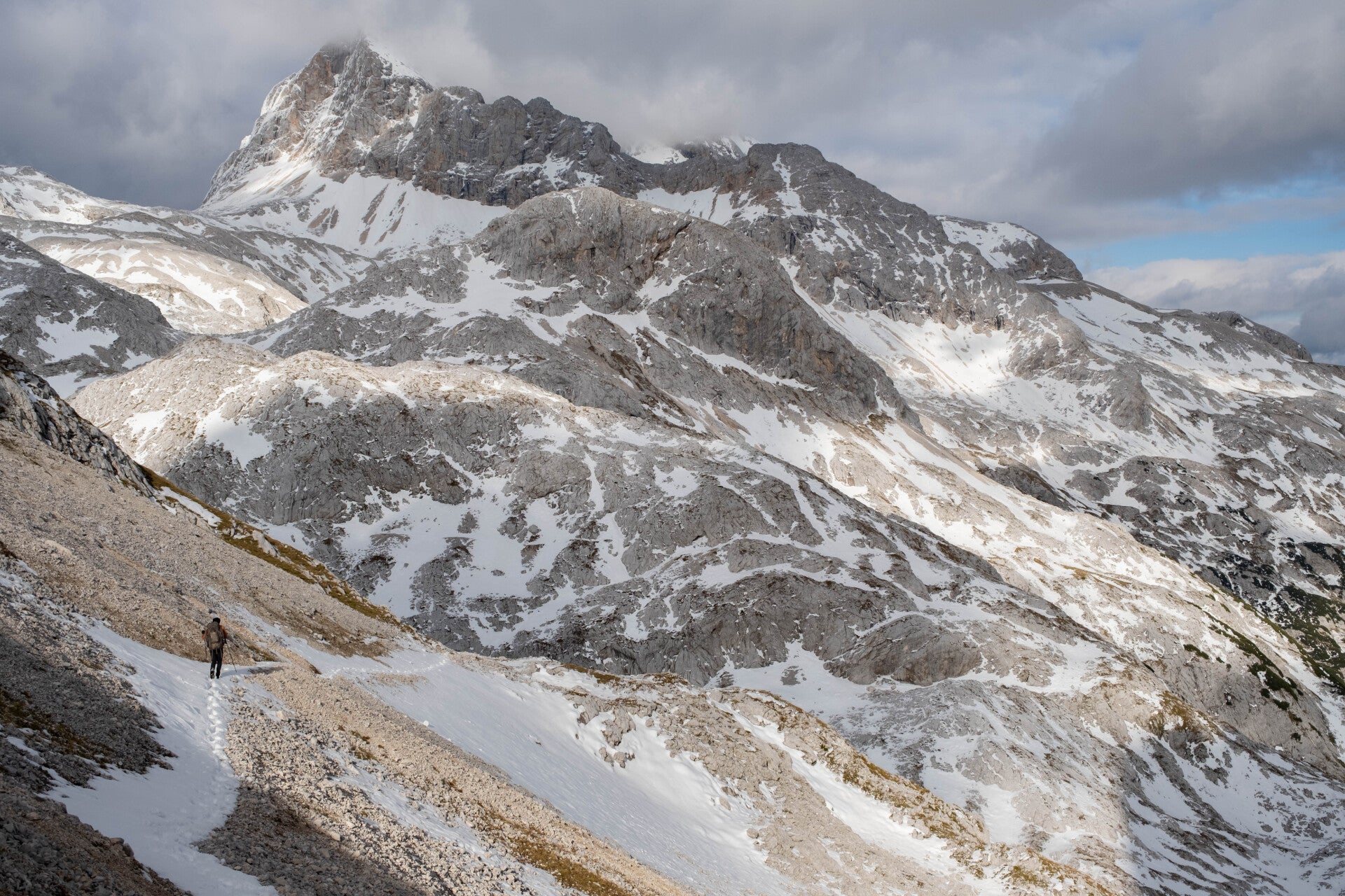 Nous basculons de l'autre côté du col. Nous aurions dû apercevoir la cime du Triglav mais celle-ci s'est retrouvée totalement cachée par les nuages.