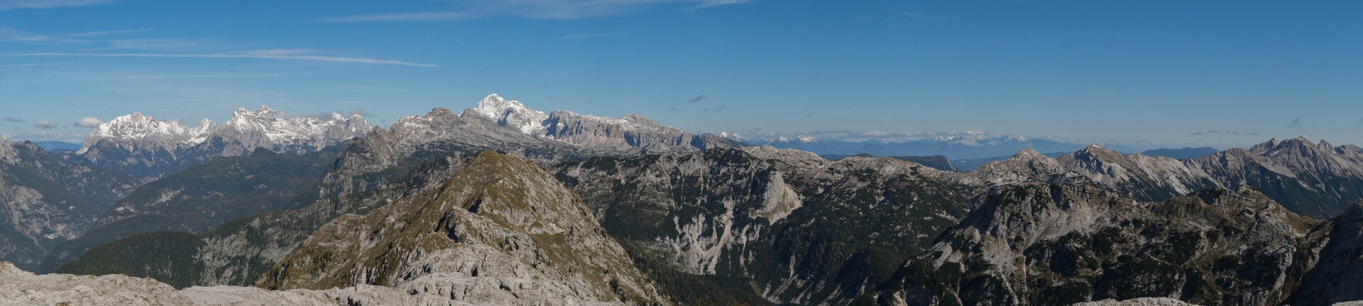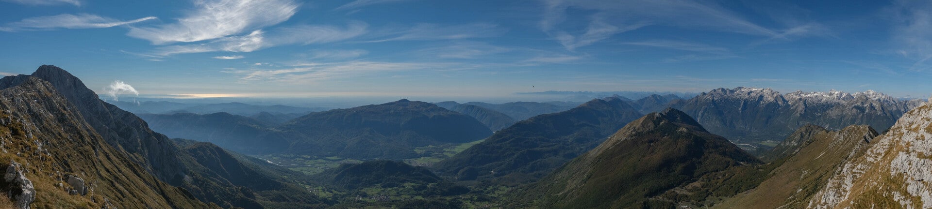 Du Krn 2244m à gauche aux Alpes Juliennes à droite en passant par la Mer Adriatique et les Dolomites.