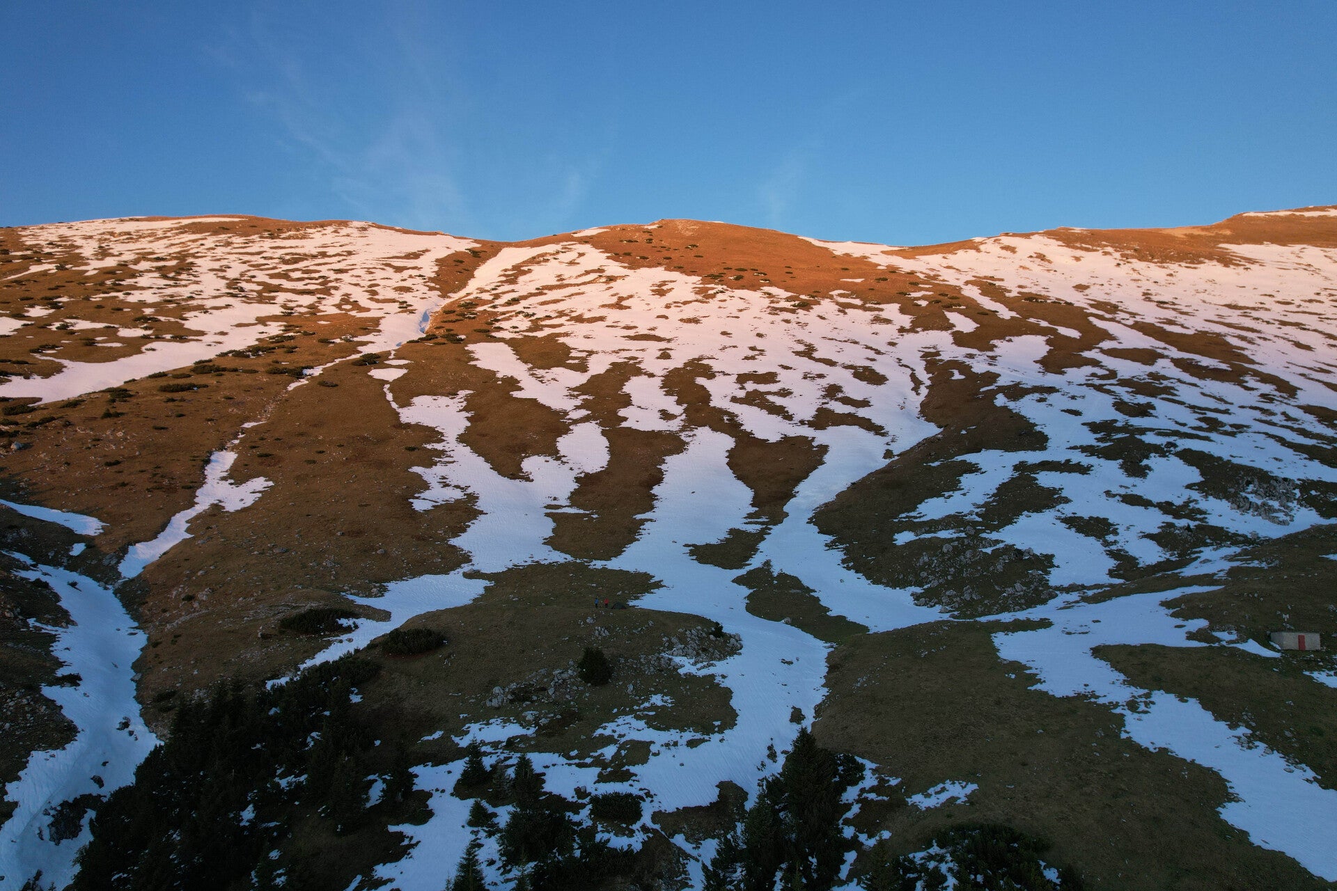 Sur l'arête, seul le versant slovène s'offre les derniers rayons, le côté autrichien est dans l'ombre depuis bien longtemps. Et oui, on se situe juste à côté de la frontière autrichienne.