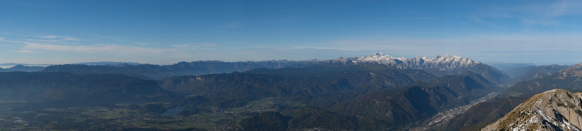De l'autre côté, les Alpes slovènes s'imposent avec le vaste Triglavski Narodni Park (le Parc National du Triglav). Triglav que l'on aperçoit au centre gauche recouvert d'un manteau blanc.