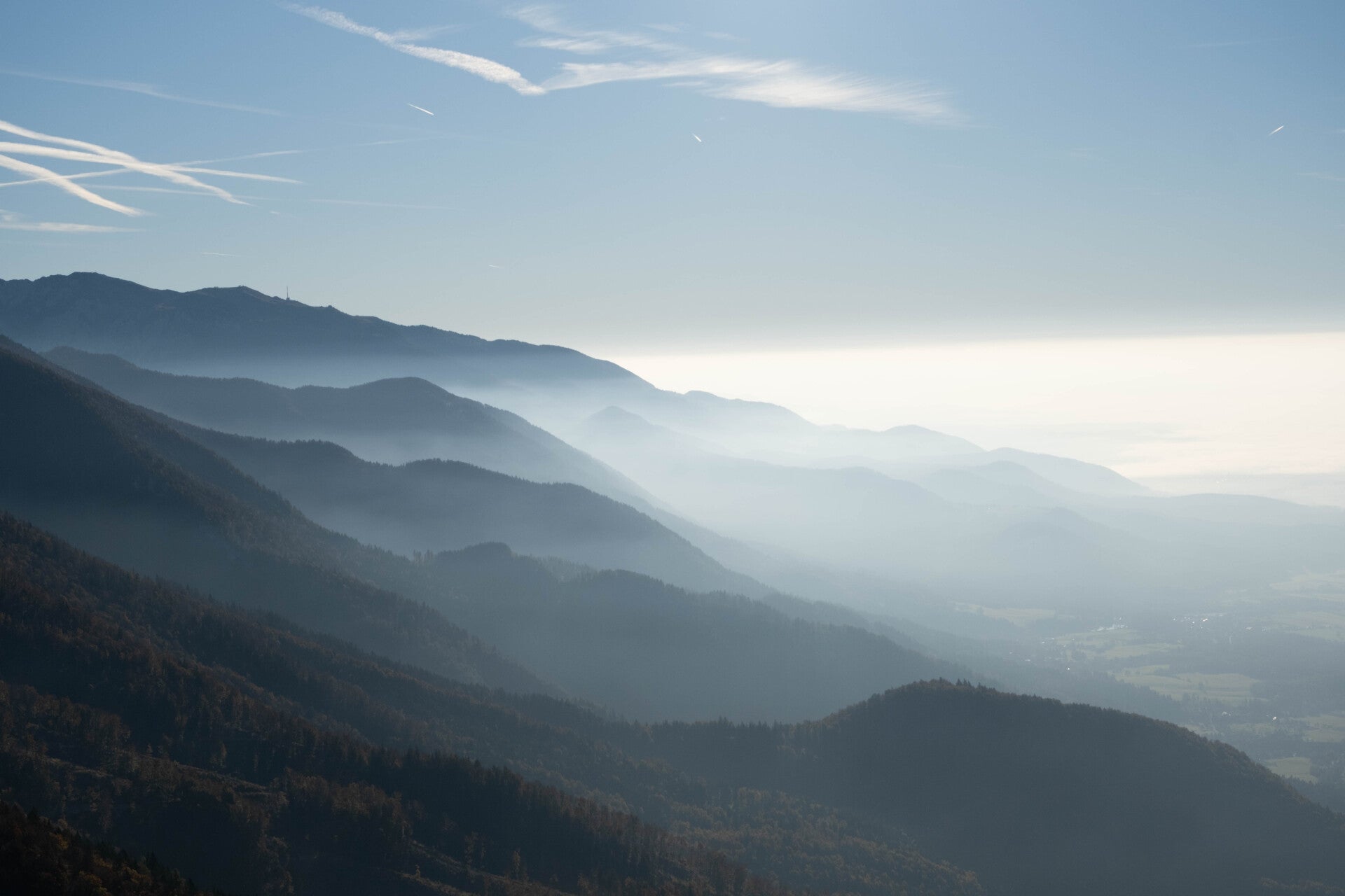 Les plaines slovènes et le Storžič depuis le Mali Grintavec. Les Alpes Juliennes se sont évanouies dans les plaines au loin.
