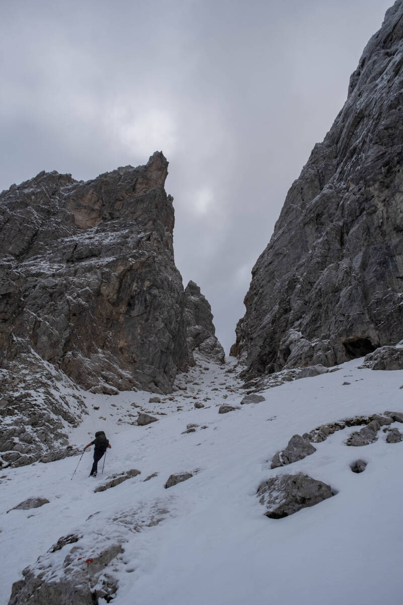 Les murs étaient assez épais pour atténuer le brame du cerf. Au réveil, les cervidés sont toujours là. Un léger saupoudrage est arrivé pendant la nuit mais rien de quoi compromettre l'étape du jour. Nous avons un col à plus de 2100m à franchir : la Forcella Lavinal dell'Orso. Col qui, dans notre esprit, ne devrait pas être trop compliqué à gravir au vu de la faible quantité de neige dans le massif. C'était sans compter l'épaisse couche de glace et la forte inclinaison de la pente sur les 300 derniers mètres menant au col.