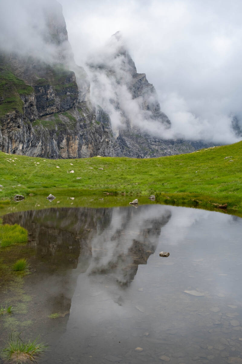 Au réveil, les nuages sont encore bien présents mais la pluie s'est arrêtée. C'est donc au sec que nous commençons l'ascension du col du jour : le Surenenpass. La nébulosité se contente des cimes, nous laissant apercevoir quelques pans des montagnes. Nous changeons de nouveau de canton avant d'attaquer la montée : après un bref passage dans le Canton d'Obwald nous arrivons dans le Canton d'Uri.