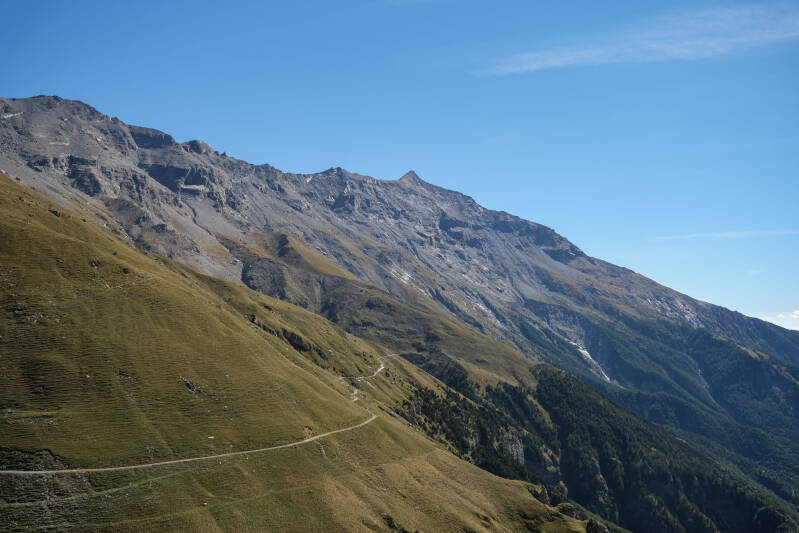 Sur la gauche de la photo ci-dessus, on observe les quelques baraquements de l'Alpe Tour situés à un peu plus de 2200m. C'est à partir de ce petit hameau que le sentier quitte la piste carrossable pour grimper dans l'alpage. L'objectif est d'atteindre la pyramide herbeuse située au centre de la photo. Un petit refuge, le Rifugio Stellina, trône sur ce sommet. Ensuite, un sentier divaguera dans les pentes abruptes pour déboucher au Col de Novalèse, sur la crête rocheuse surplombant le refuge. Après ces 6km de piste, le dénivelé restant est globalement le même, la piste alternant portions ascendantes et portions descendantes.
