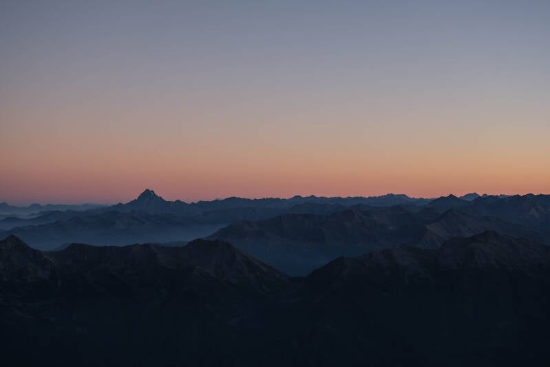 Puis les vallées s'enfoncent dans la pénombre, seules les hautes cimes baignent sous les derniers rayons.