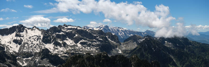 De gauche à droite : Le Grand Pic de Belledonne, le Pic Central de Belledonne, la Croix de Belledonne, le Pic du Grand Domènon et la Grande Lauzière.