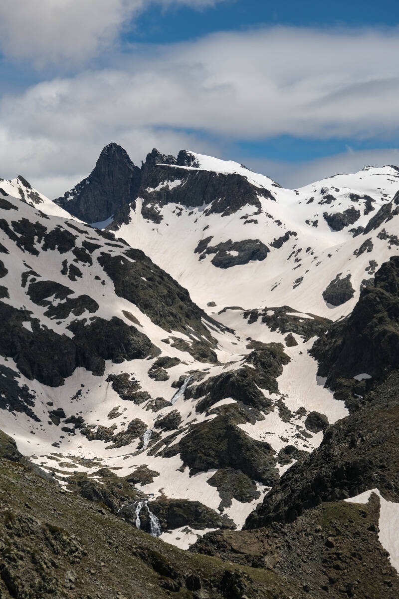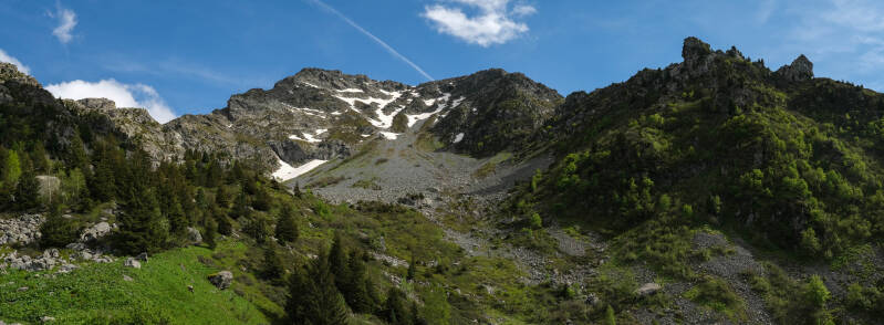 Au lieu de rejoindre directement l'alpage de la Pra, on part à la recherche des quelques autres lacs de la zone. On suit ainsi l'émissaire du Lac Merlat pour rejoindre un petit plateau verdoyant où dégoulinent avec fracas les différents torrents grossis par l'eau de fonte.