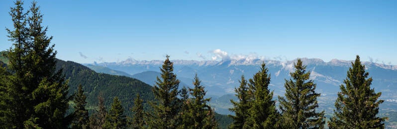 Au-delà de la forêt de conifères, la vue se dégage à l'Est, au Sud et au Nord. La barrière orientale du Vercors et les Hauts de Chartreuse encadrent parfaitement les différentes vallées iséroises et la cuvette Grenobloise.