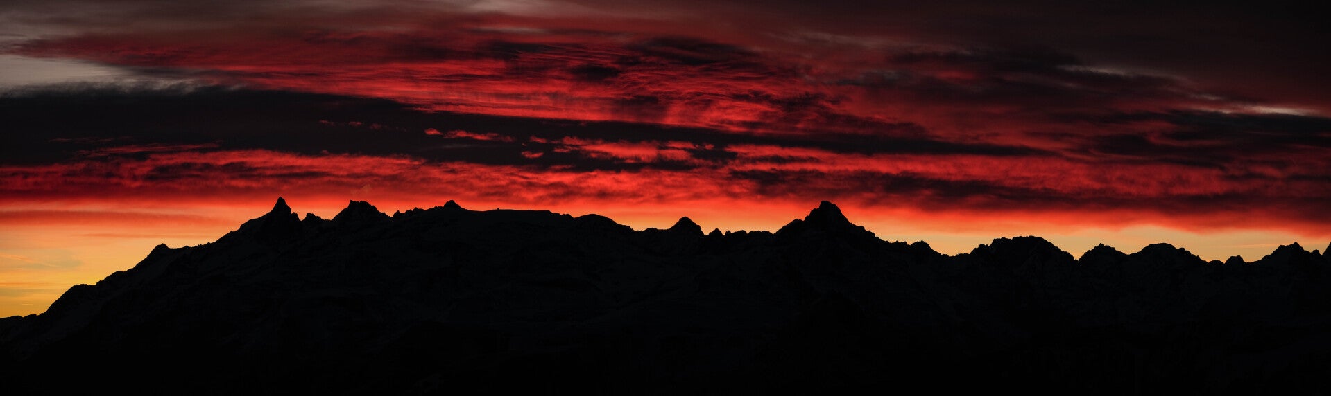En l'espace de quelques minutes, le ciel des Ecrins s'enflamme avant même que les sommets ne soient frappés par les premiers rayons. La luminosité et le ciel décalquent parfaitement le Massif des Ecrins. En regardant ce tableau mouvant, on n'en oublierait presque les picotements du froid à nos pieds, à nos mains et sur notre visage.