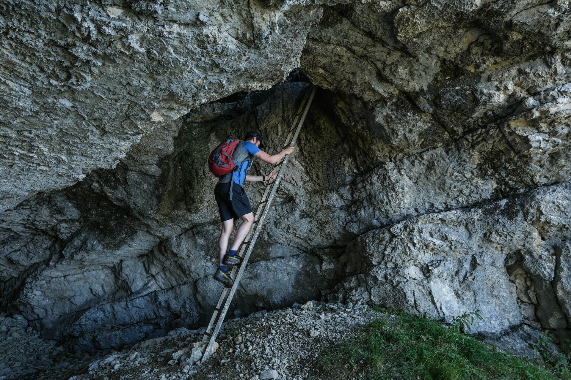 En haut du cirque, on s'immisce dans une cavité étrangement agrémentée d'une échelle en son coeur. C'est l'unique voie d'accès à la partie supérieure de la montagne. Appelée Grotte à l'Echelle ou encore Trou de la Saignerie, son accès est ouvert dès 1939 avec la pose de l'échelle par des habitants de la vallée.