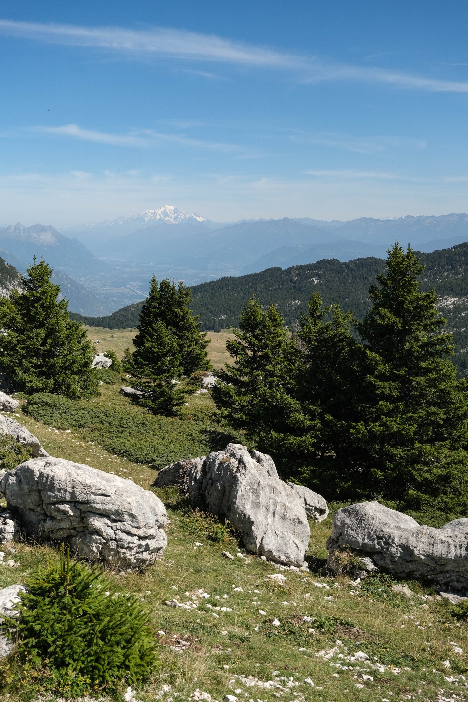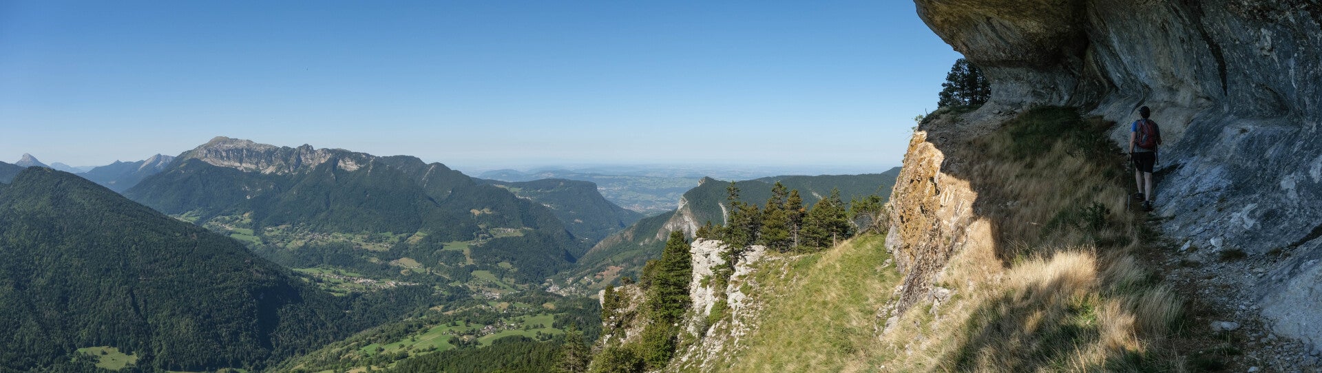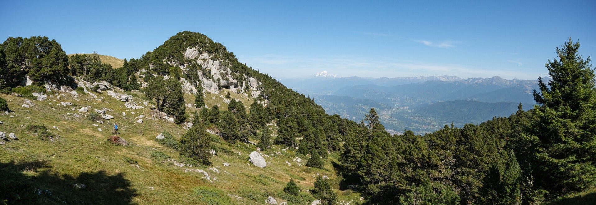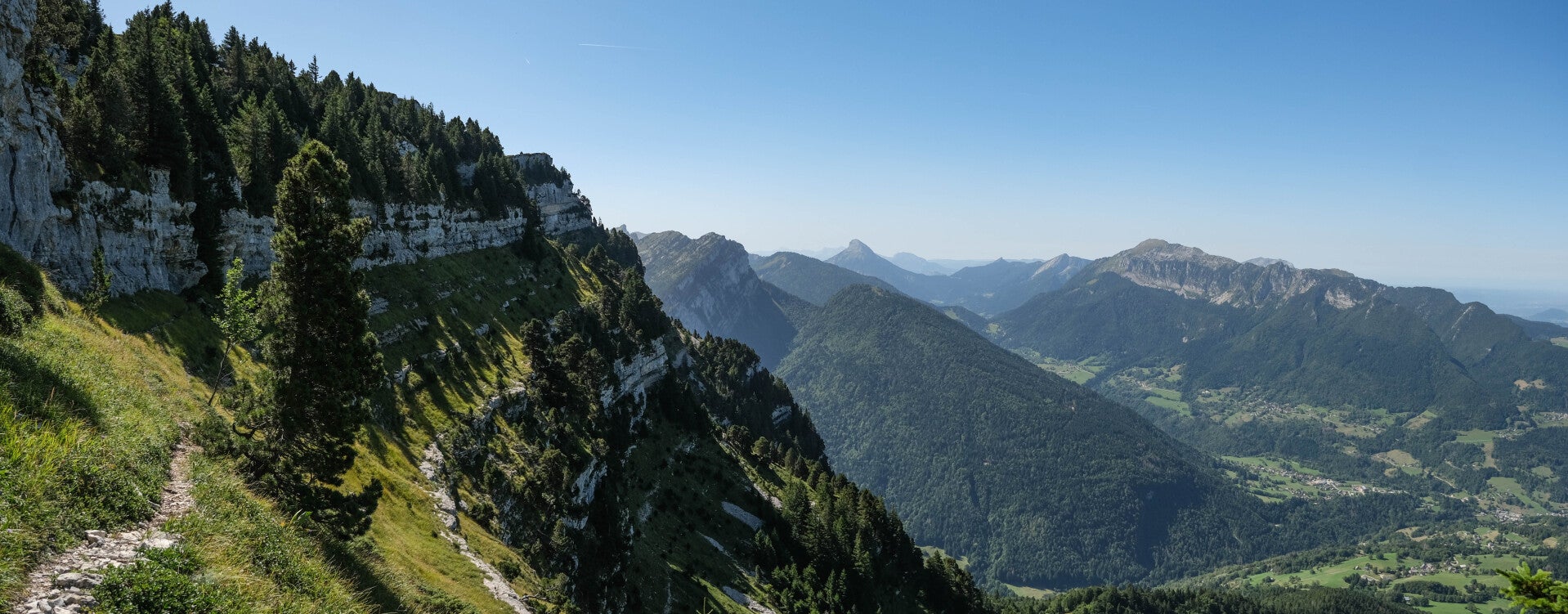 Une fois sur la crête, le panorama s'amplifie avec l'arrivée du Mont Blanc, des Bauges, de la Lauzière et de Belledonne. Sans parler du Mont Granier qui nous domine de moins de cent mètres.
