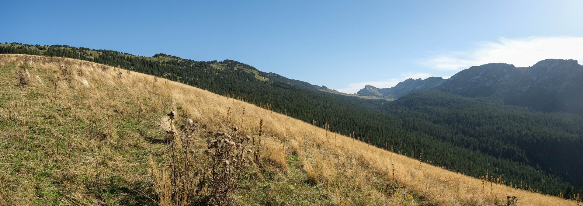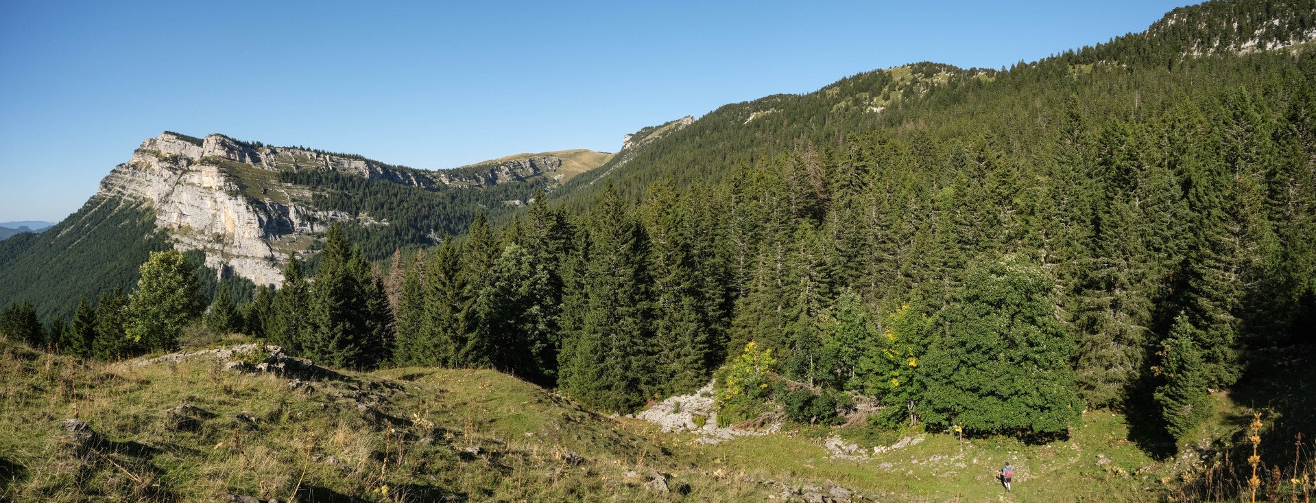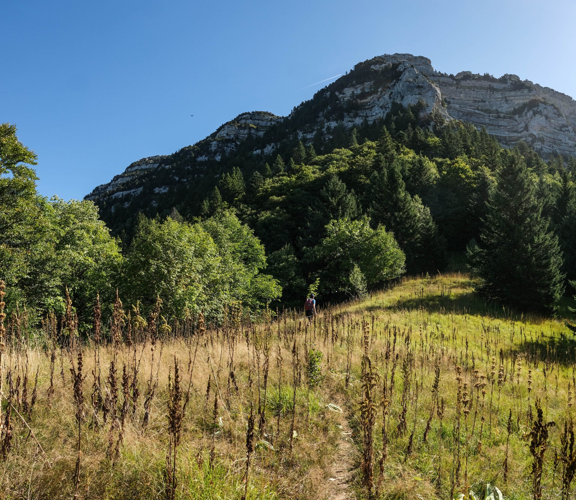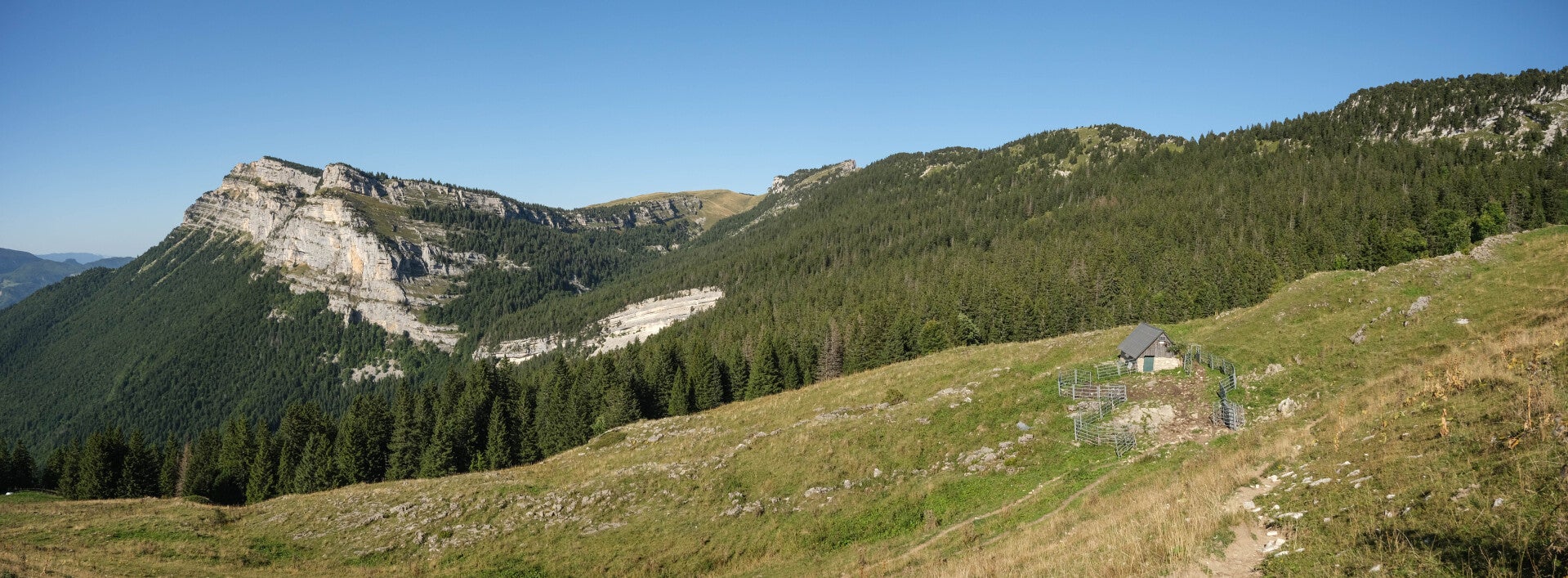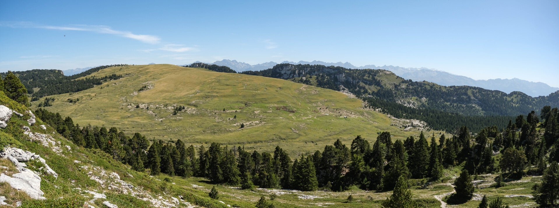 Une fois à la Cabane de l'Alpettaz (propriété réservée pour les bergers et l'estive), on met pied sur le GrP. La butte herbeuse de l'Alpette des Dames permet une vue d'ensemble à la fois au Sud sur le Vallon de Marcieu dominé notamment par les Lances de Malissard et au Nord avec une grande partie du chemin parcouru depuis ce matin. On profite d'autant plus que la suite et fin de l'itinéraire se fera en sous-bois.