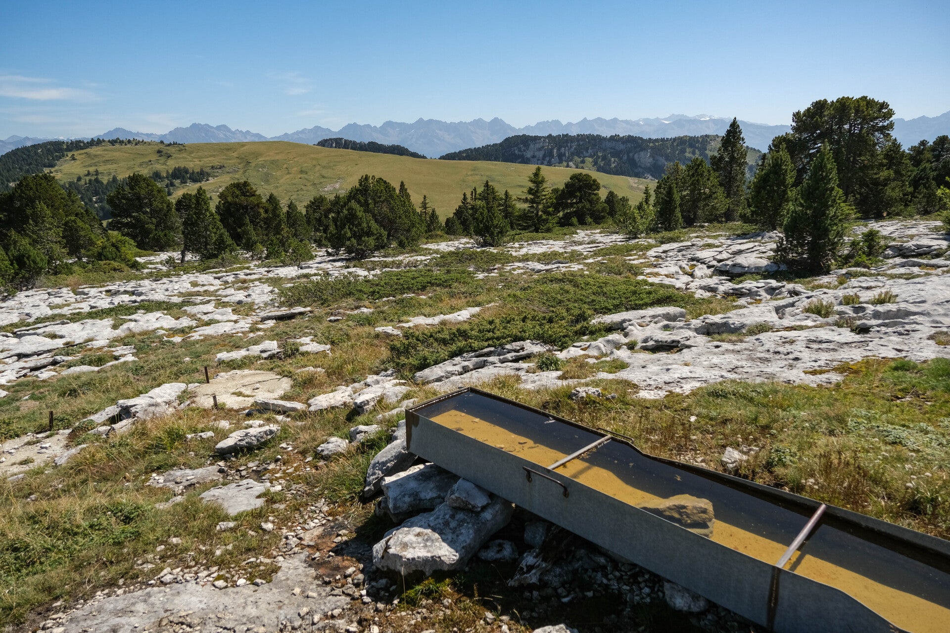 Une autre conséquence de ce relief calcaire est l'aridité des lieux. Il y a peu voire pas d'eau du tout sur cette portion. Nous croiserons uniquement cet abreuvoir, tout de même bien rempli il faut le dire, posé au milieu du plateau.