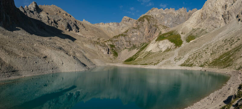 En direction du Col des Béraudes, tout à gauche de la photo. Face à nous, la Crête de Moutouze plonge dans le Lac.