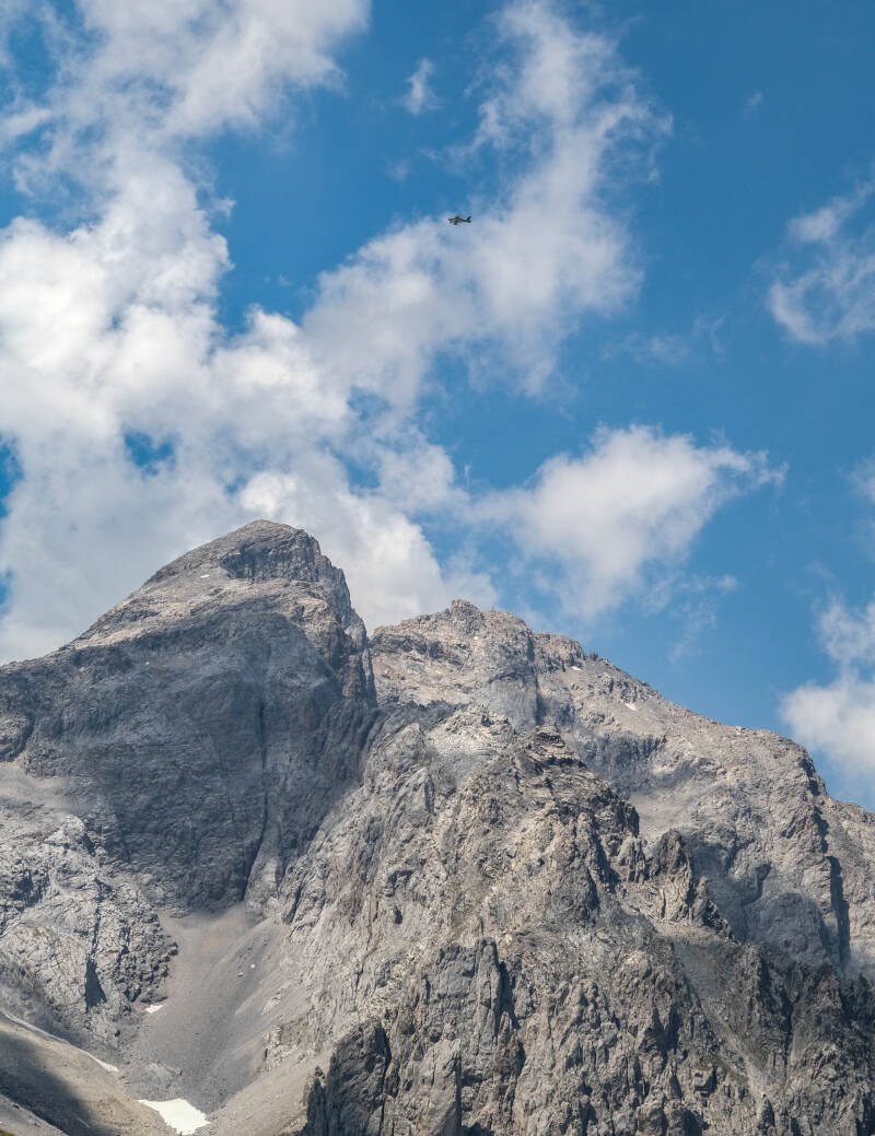 Le décor rocheux de la Pointe des Cerces surplombe l'alpage. On ne voit d'ailleurs pas le sommet mais une partie de l'arête sommitale se dessine au centre gauche, au-dessus de l'éboulis.