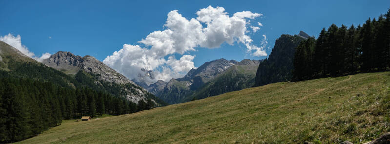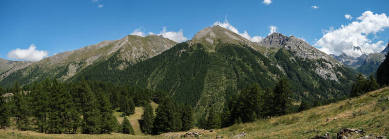Après quelques centaines de mètres, on s'extirpe du mélézin en traversant l'Alpage de la Médille. De là, on bénéficie d'une ample vue sur le fond du Haut-Guil. Même le Mont Viso dépasse des crêtes frontalières. Encore faut-il que la nebbia l'autorise à dévoiler sa cime bicéphale.