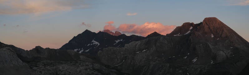 Les sommets illuminés : Le Péouvou, la Pointe des Sagnes Longues, les Pics de la Font Sancte, la Pointe des Avers et le Pic des Heuvières.