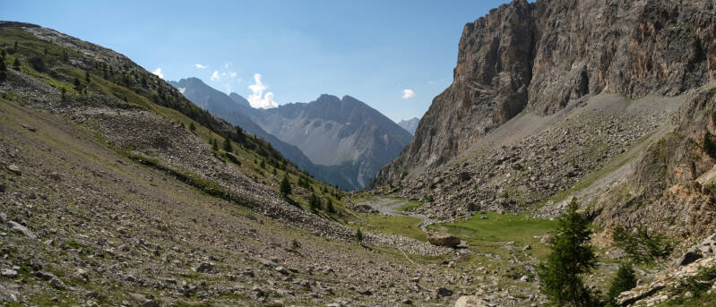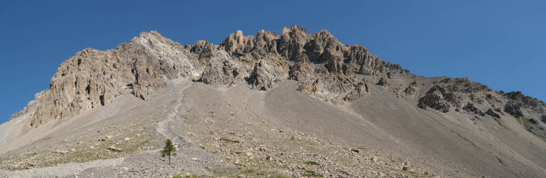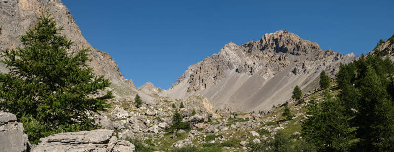 Dès notre sortie de la forêt, on fait face aux cimes acérées du Massif du Chambeyron (de gauche à droite) : l'Aiguille Pierre André, le Grand Bec de la Blachière, l'Aiguille de Chillol, l'Aiguille Grande, la Pointe d'Aval, la Souvagea. Le point culminant, l'Aiguille de Chambeyron est encore cachée par l'Aiguille Grande 3064m.