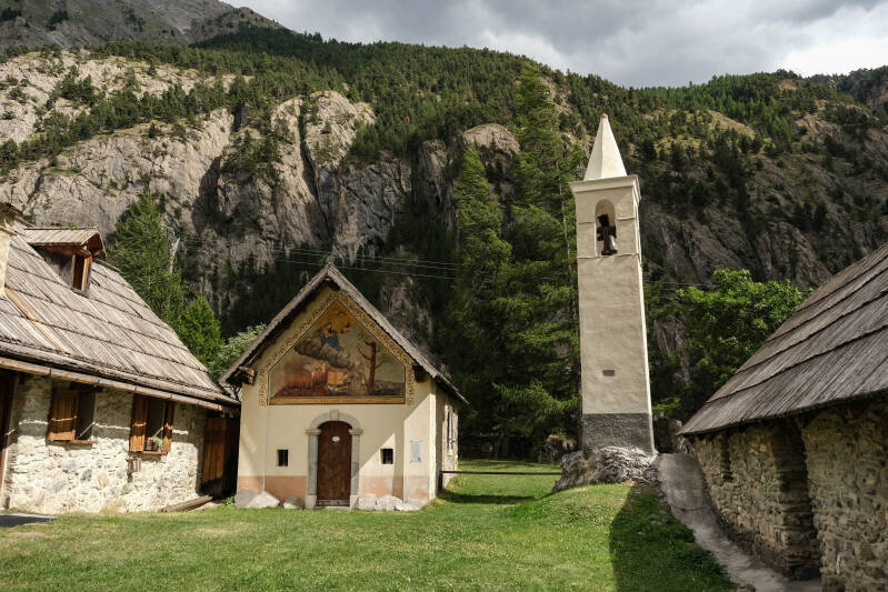 D'autant plus que la descente est plus rapide que par le Vallon des Houerts. On poursuivra donc sur la route en direction de Saint-Paul sur Ubaye en attendant que l'autre partie du groupe ne finalise sa descension. On passera ainsi près du petit hameau de Saint-Antoine avec sa chapelle, sa fresque et son beffroi (photo de gauche), près du Pont du Châtelet sur la route menant à Fouillouse (photo ci-dessous) ainsi que près du hameau de la Grande Serenne (photo du gauche). De quoi, une nouvelle fois, apprécier la diversité paysagère et architecturale de cette extrémité de Provence.