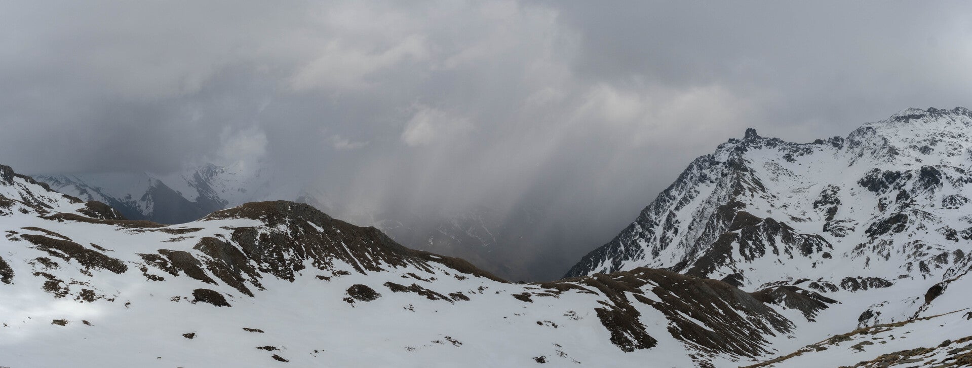 Au Col de Saint-Véran 2844m, le Val Varaita semble pris dans la tempête de neige. La Rocca Bianca, à droite, s'apprête, tout comme nous, à faire face aux premières rafales.