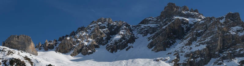 En montant au Col de Chanrouge, le versant d'en face, exposé plutôt Nord, conserve sa majesté hivernale. Il sera notre terrain de jeu lors de la journée du lendemain.