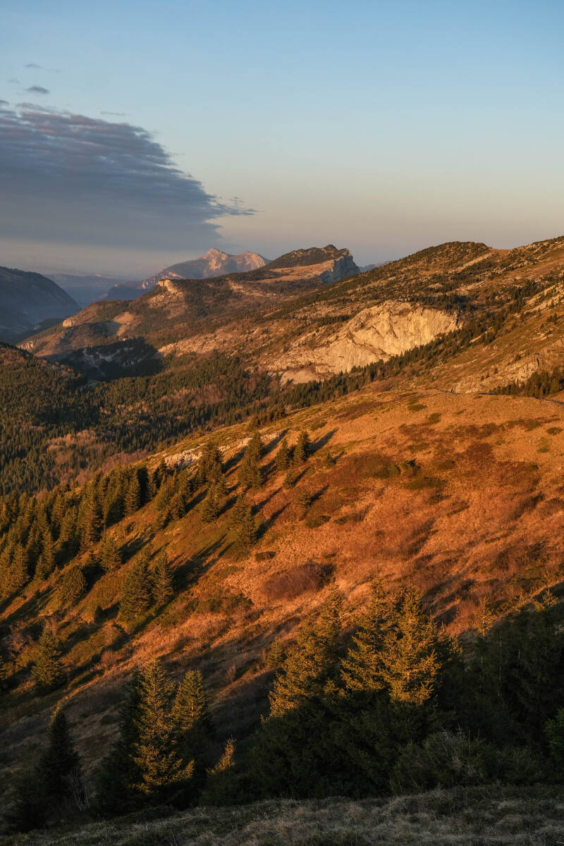 La barrière orientale du Vercors se parent de jaune en cette fin de soirée. Parois et alpages se confondent.
