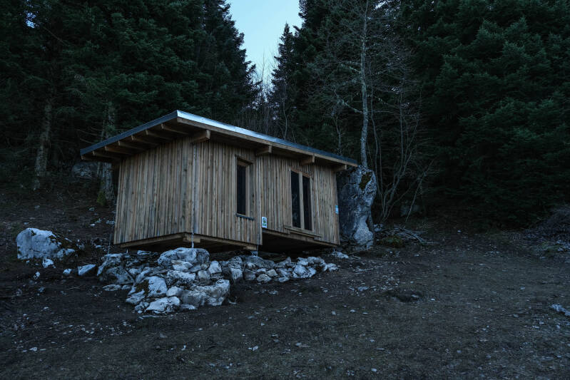 Au bout de quelques dizaines de minutes de traversée à travers la Combe Chaulange et la Combe Noire, on arrive au croisement de Font Froide. On met pied sur la voie normale menant au Col de l'Arc. Avant de sortir du bois et de s'attaquer au col, nous croiserons un petit baraquement flambant neuf sur les bords du sentier.