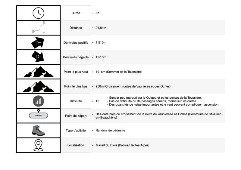 La Toussière constitue ainsi le troisième plus haut sommet du Massif du Diois avec ses 1916m. Un réseau d'arêtes tentaculaire partant de sa cime permet d'atteindre cette dernière via différentes voies d'accès. Du fait de l'enneigement, on élimine les arêtes Nord et Nord-Est et on se concentre sur l'Est et le Sud. De là, les petits hameaux du Haut-Buëch sont des points de départs parfaits pour partir à l'assaut de la Toussière que l'on devine d'ailleurs dès le départ de la randonnée.