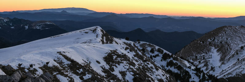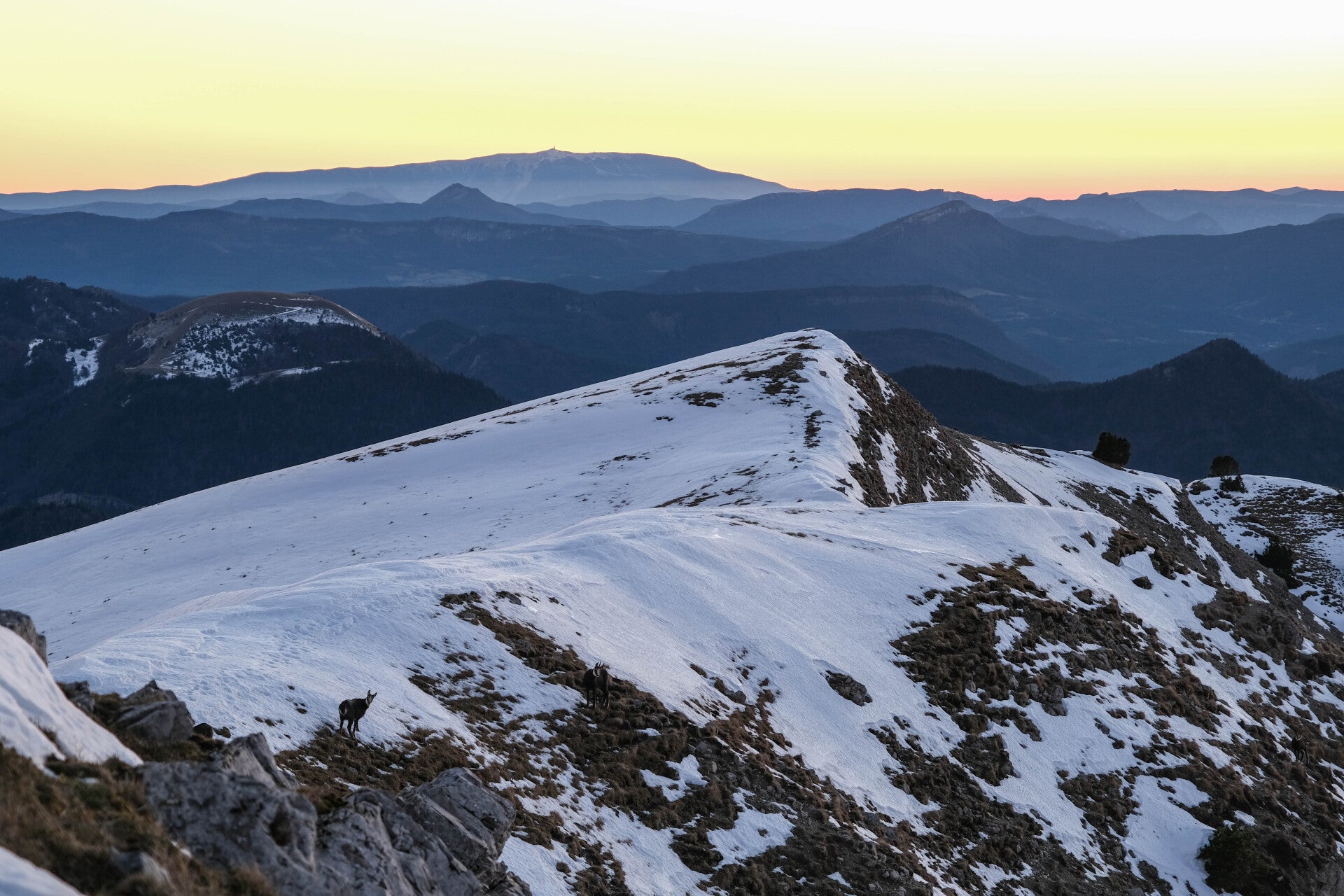 Avant de descendre vers la bergerie, on croise une horde de chamois qui pensait être tranquille pour le début de la soirée. Après quelques secondes d'étonnement, ils plongent dans les ravines de la face Nord-Ouest de la Toussière. On les capture avec le Mont Ventoux en arrière-plan avant qu'ils ne disparaissent dans la pente.