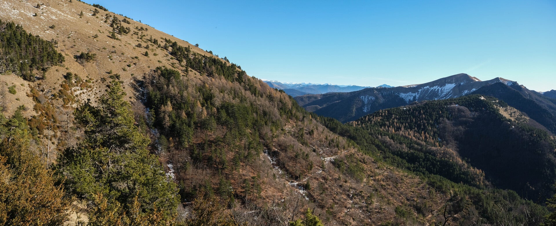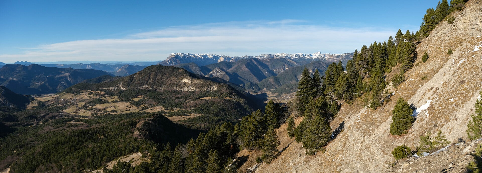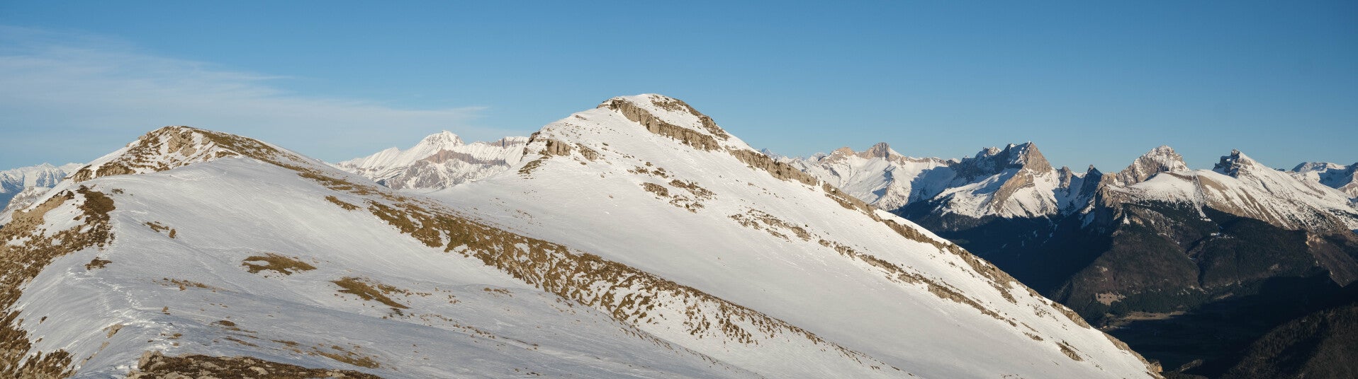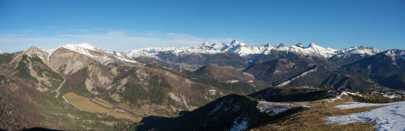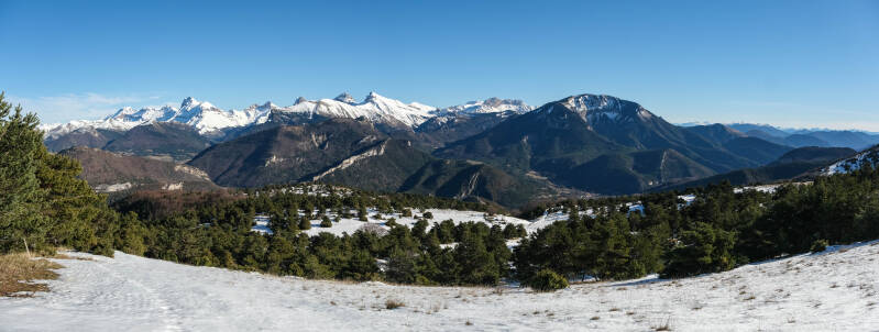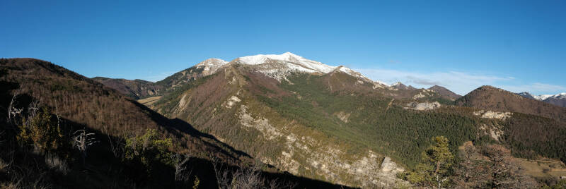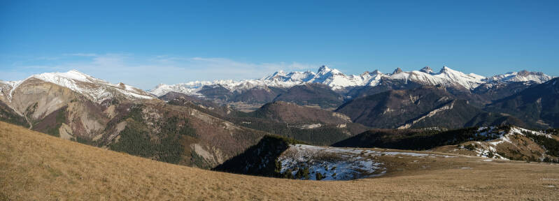Sur les pentes du Quigouret, la vue sur le Haut-Buëch est splendide. l'intégralité de la barrière dévoluarde est visible : de l'Obiou au duo du Garnesier. Même la Montagne d'Aurouze tout à droite est de la partie.