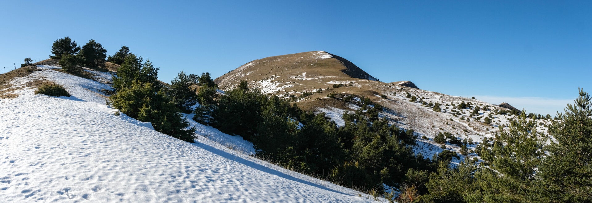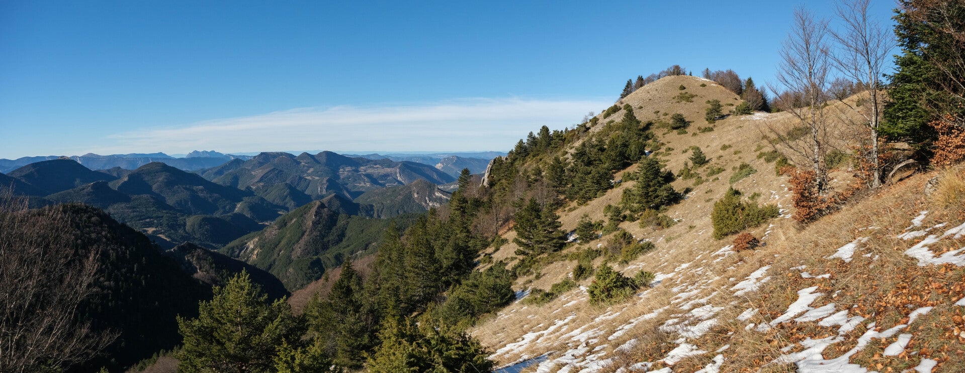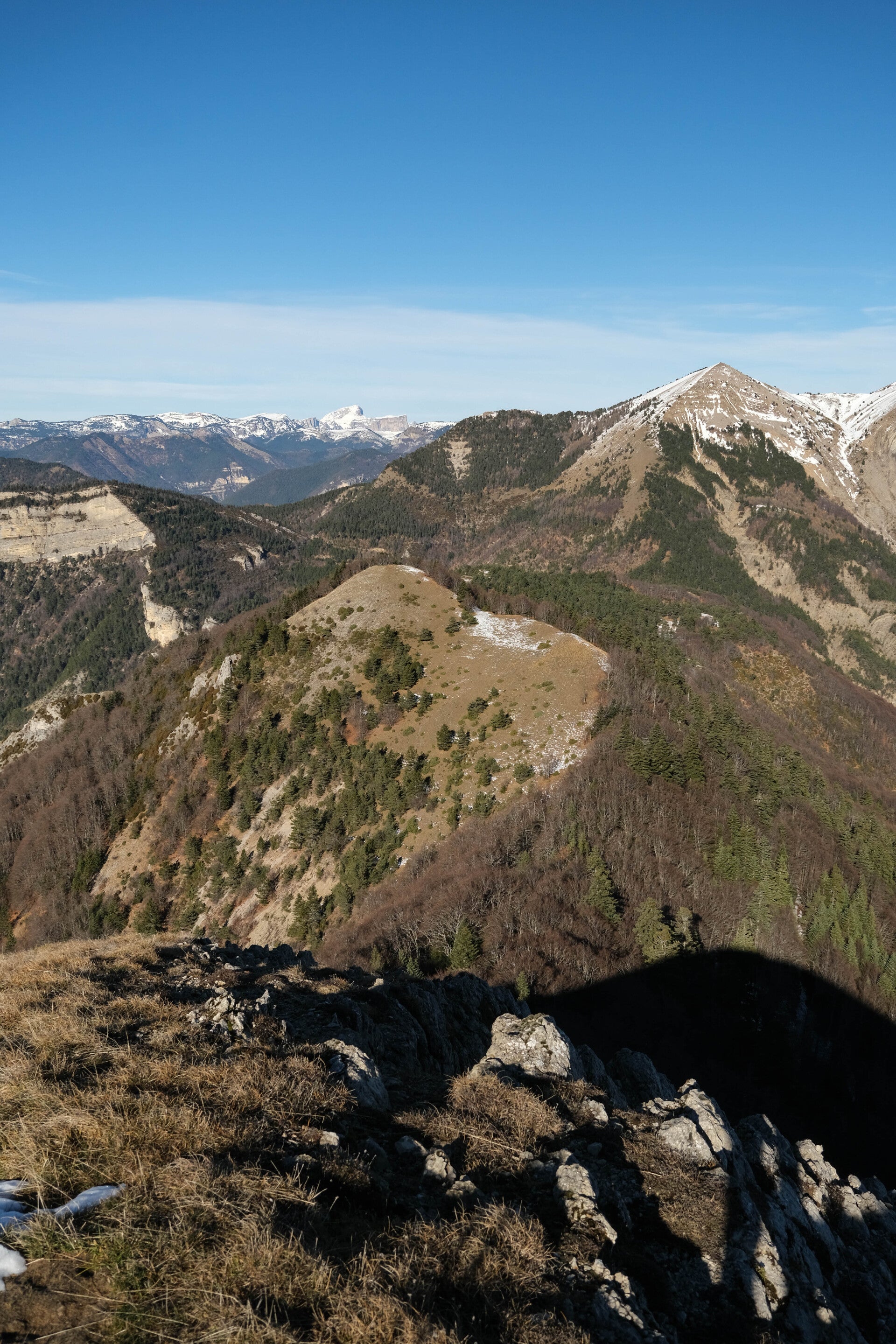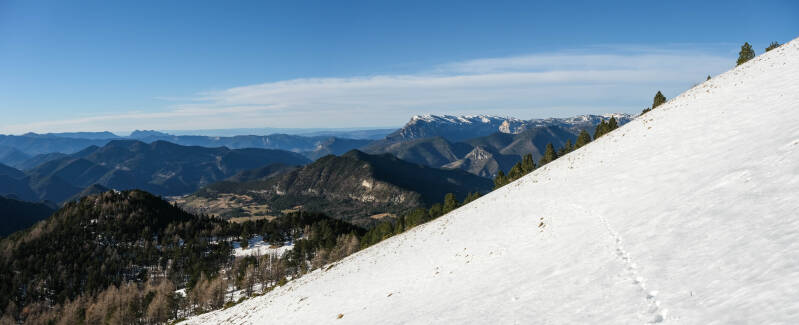 Au point 1553, la pente s'adoucit une nouvelle fois et on gagne en exposition. La neige se raréfie, tout comme les différentes traces et sentes qui se faisaient déjà très discrètes depuis le début de l'aventure. On poursuit donc à vue en restant proche de l'arête du Quigouret pour maximiser la vue au Sud et au Nord. D'ailleurs la Montagne du Glandasse, extrémité Sud du Vercors, s'aperçoit à l'Ouest.