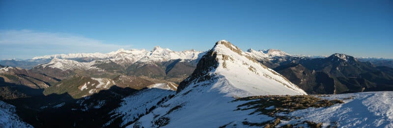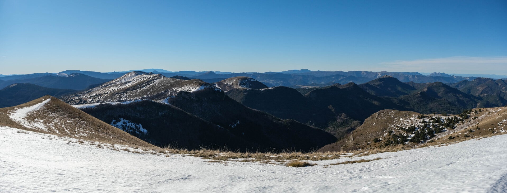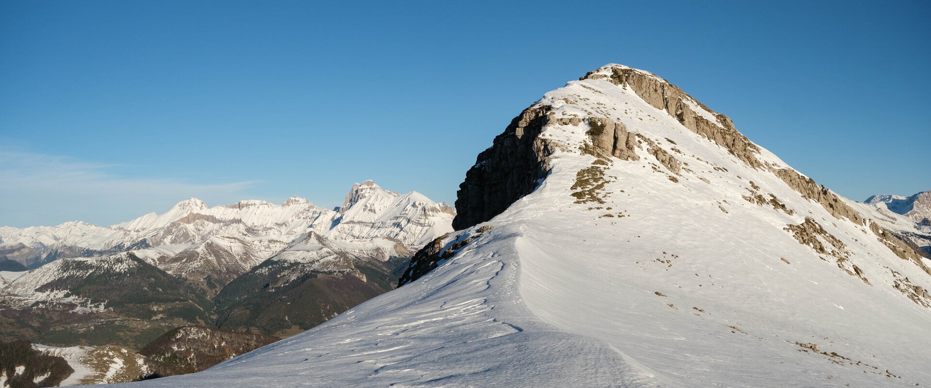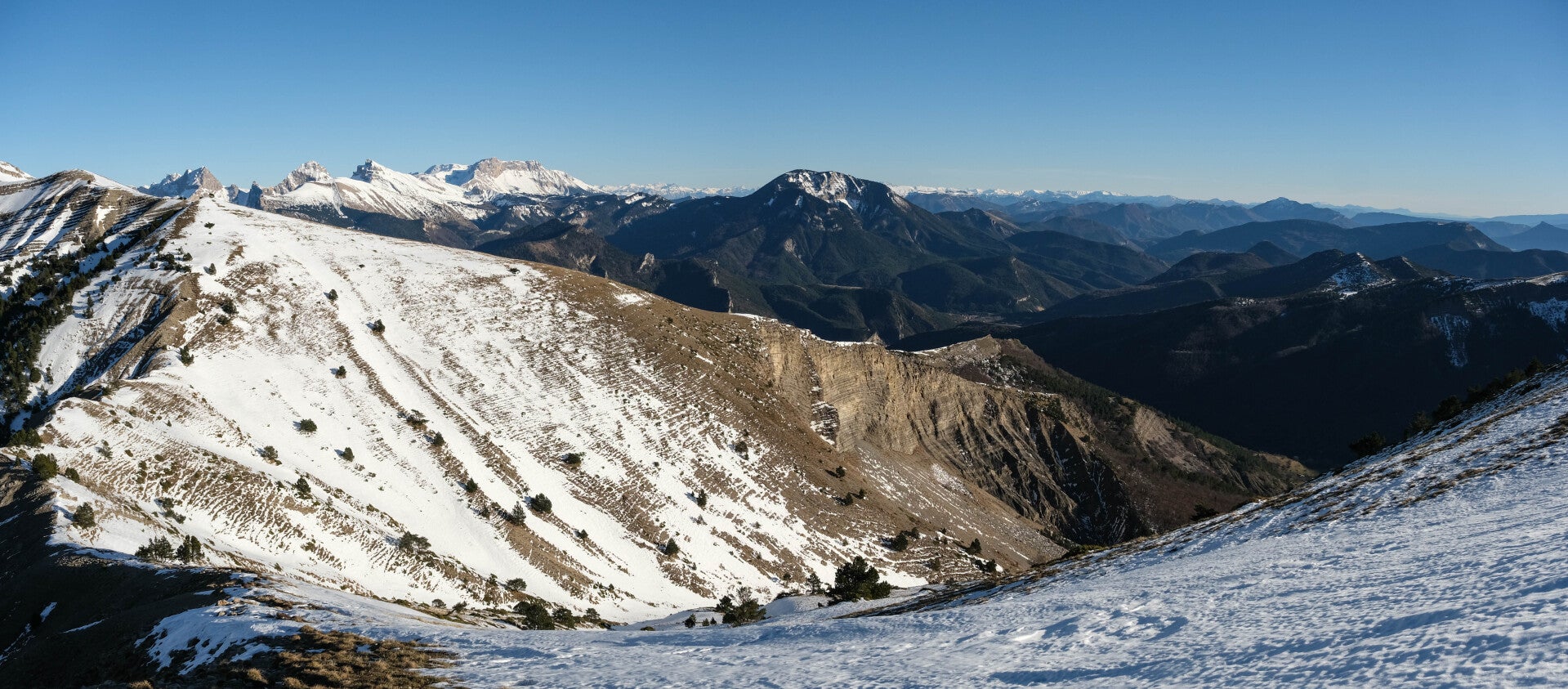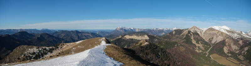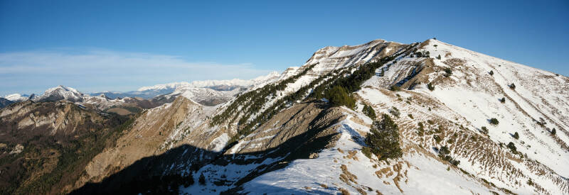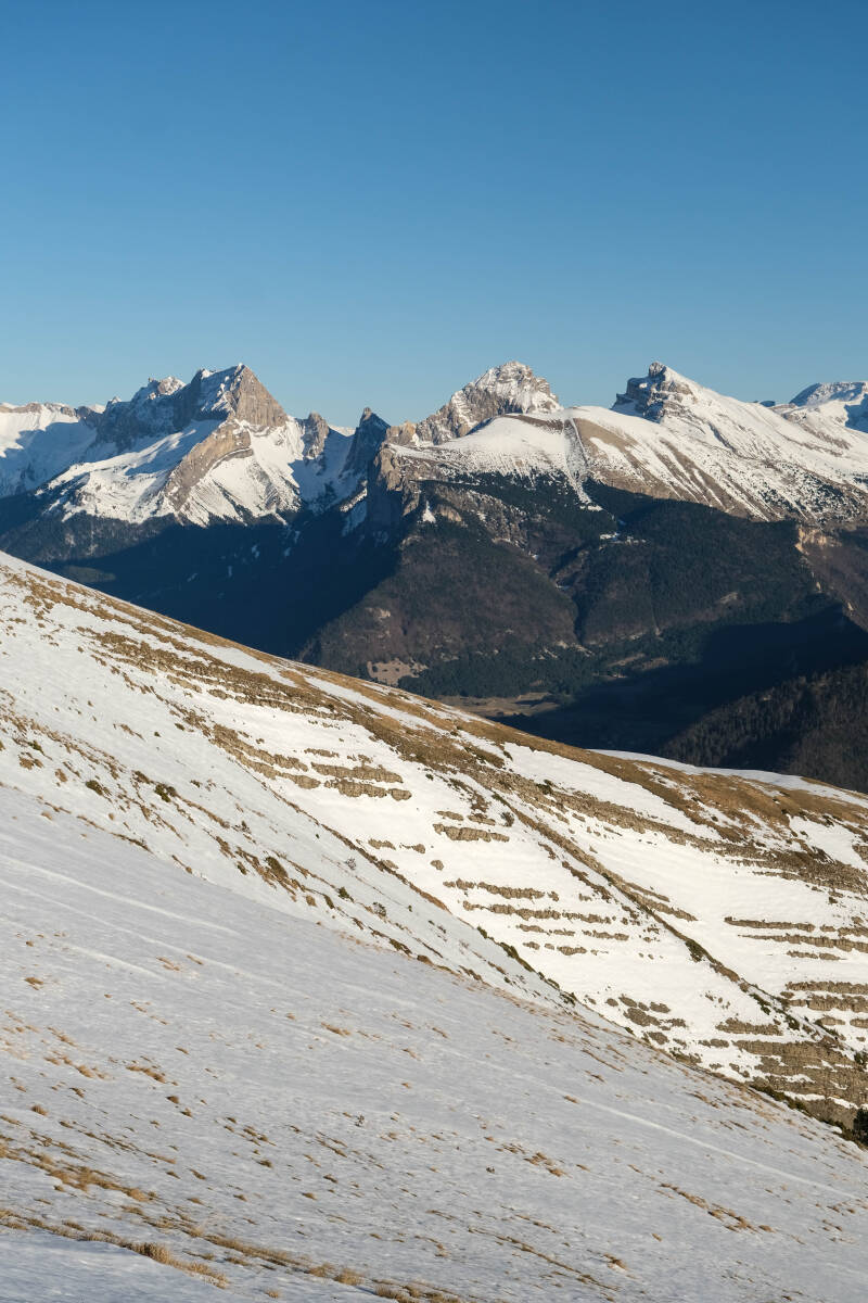 Le reste du Massif du Diois est bien sombre en cette période, le soleil ne parvenant pas à éclairer les faces Nord des montagnes. Au contraire, le panorama au Nord est particulièrement lumineux avec la Montagne du Glandasse, le Grand Veymont et même le Mont Aiguille qui pointent leur cime à gauche de la Toussière.