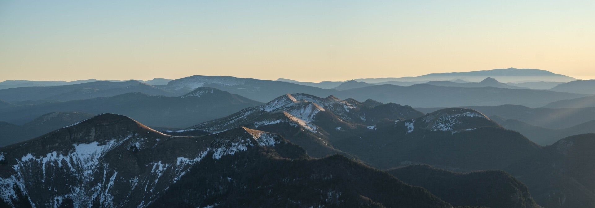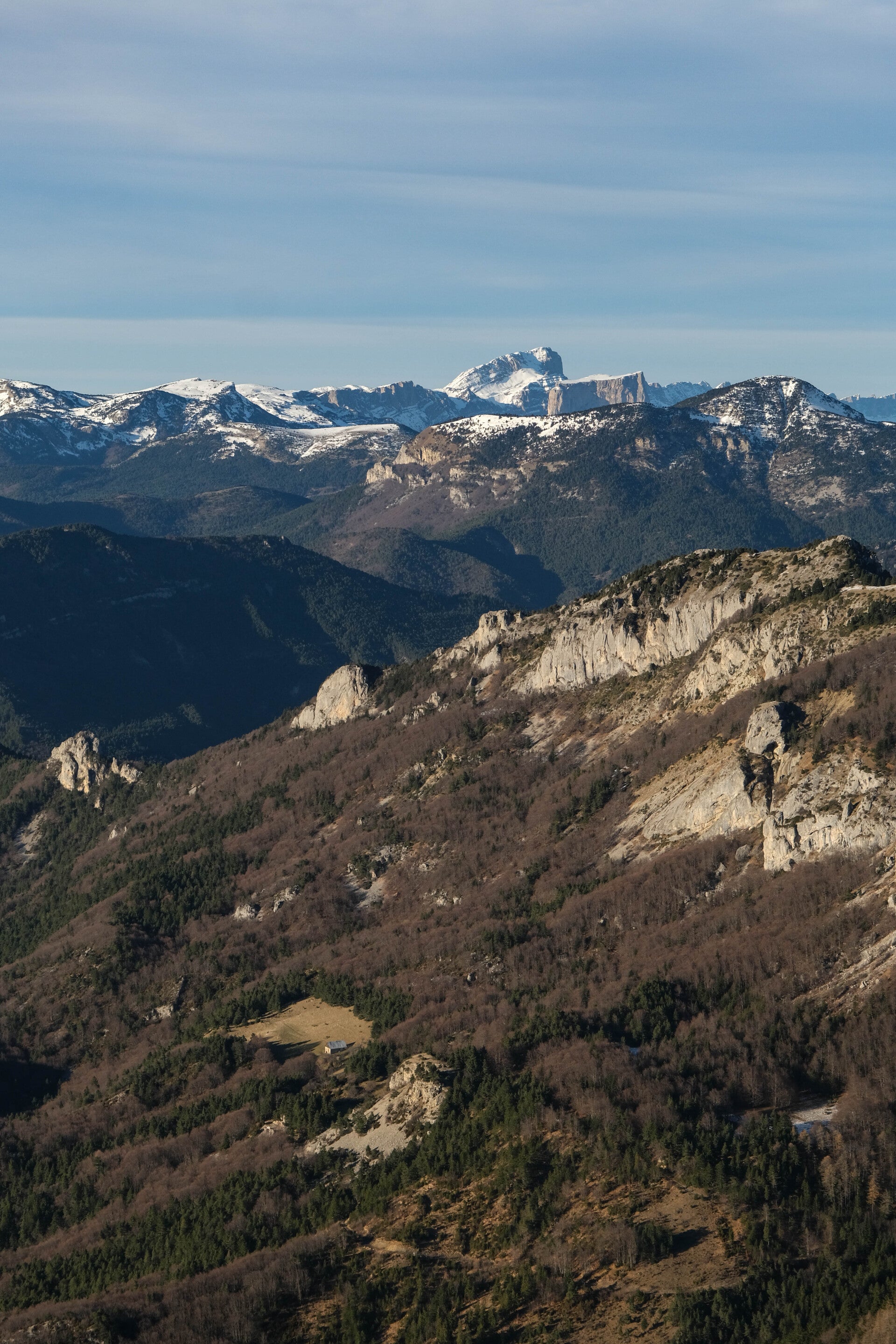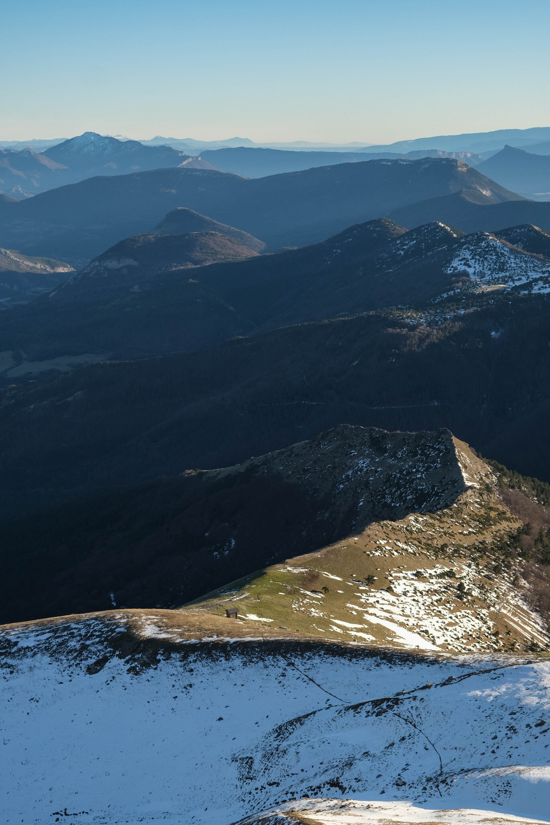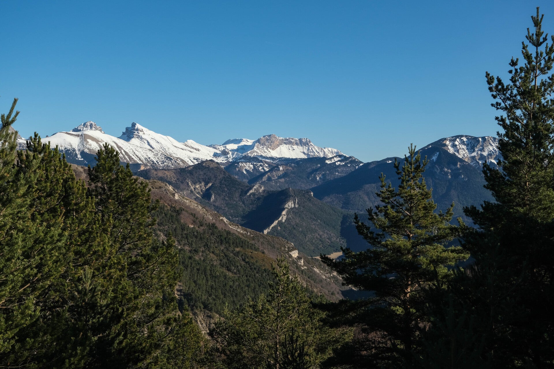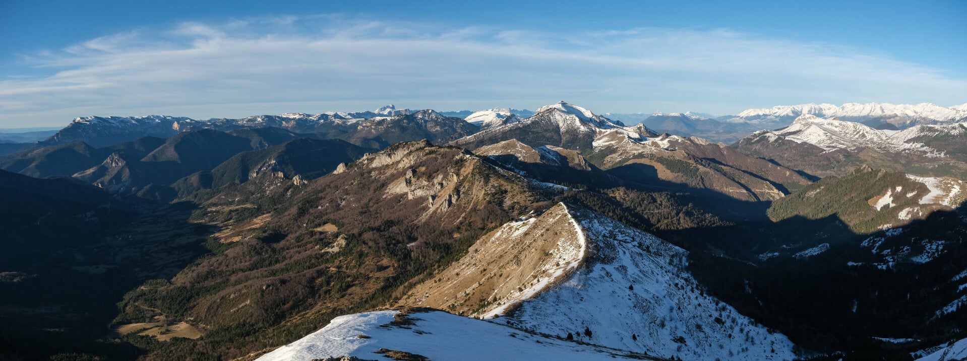 Le reste du Massif du Diois est bien sombre en cette période, le soleil ne parvenant pas à éclairer les faces Nord des montagnes. Au contraire, le panorama au Nord est particulièrement lumineux avec la Montagne du Glandasse, le Grand Veymont et même le Mont Aiguille qui pointent leur cime à gauche de la Toussière.
