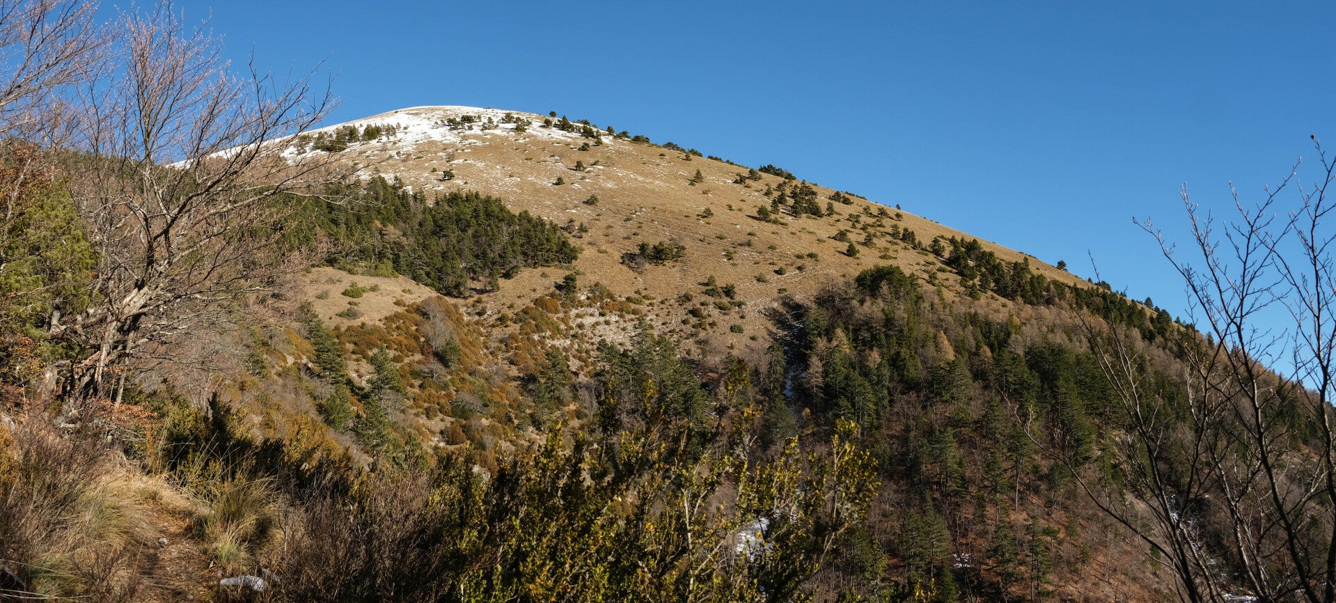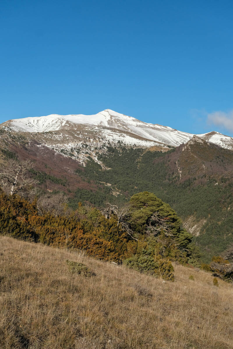 Dès les premières clairières, l'élégante Toussière apparait face à nous. Ses plus hautes pentes et arêtes semblent encore bien pétries de neige. Mais l'arrivée du redoux fera souffrir cette fine couche d'or blanc au cours de la journée. D'ailleurs, nous commençons les pieds au sec, la neige ne s'étant pas invitée dans les fonds de vallée. On arpente les douces pentes où genets, pins sylvestres, buis et lavandes constituent les principales essences végétales. On est définitivement dans les Alpes du Sud.