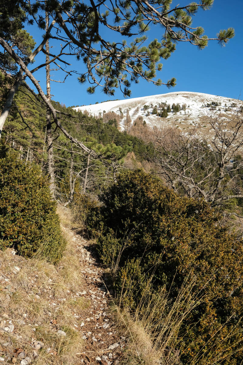 Quelques mètres avant de franchir le Col Varaime 1447m, le sentier s'élève dans le versant Sud-Ouest de la Pare. La neige et l'hiver ne sont que souvenirs sur les premières centaines de mètres, la végétation sud-alpine et le soleil s'imposant sur ces pentes.