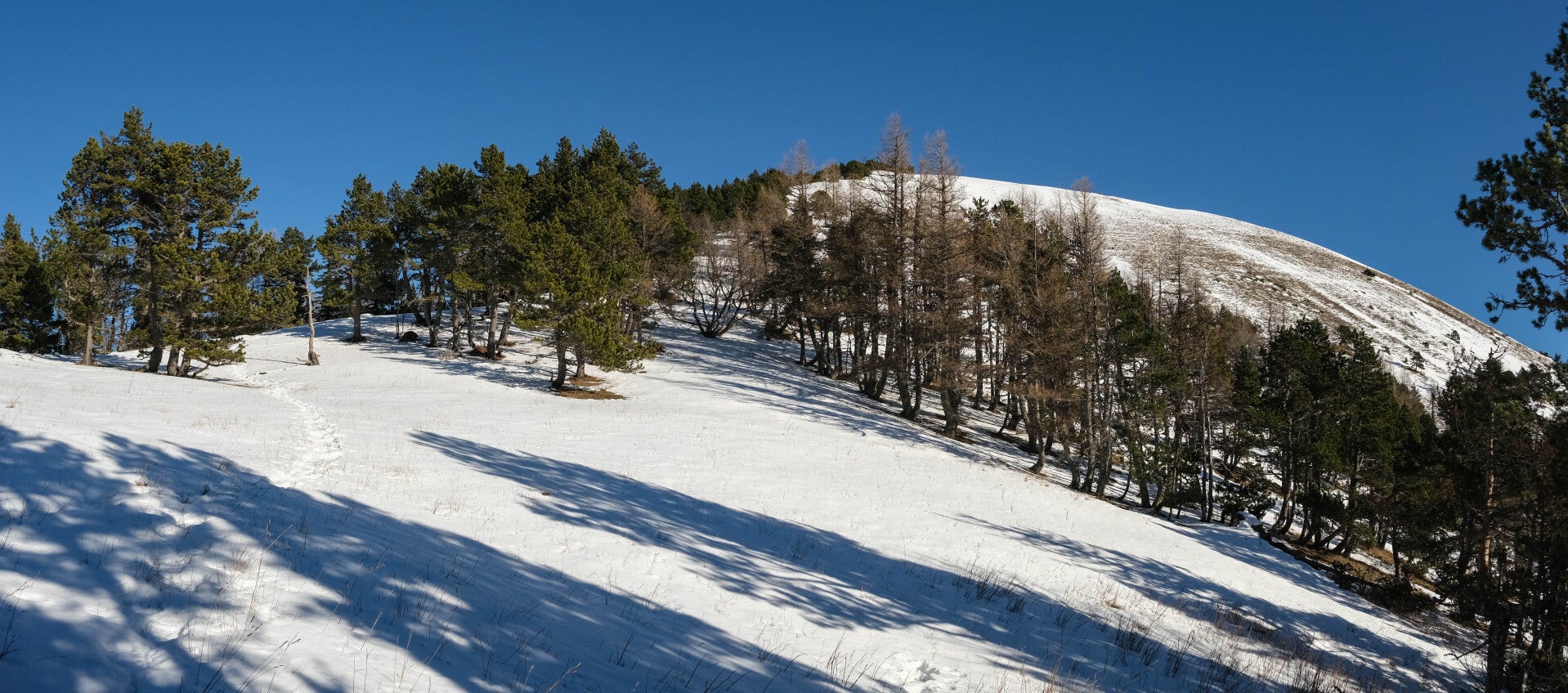 En l'espace de quelques minutes, et en raison d'un pivotement vers l'Ouest de la pente, on bascule en hiver. La pinède voit son sous-bois totalement enneigé et la suite de l'itinéraire vers le sommet de la Pare semble l'être tout autant. La chaleur de la journée ayant fait son oeuvre, la progression sur ces 100m de dénivelés va s'avérer quelques peu pénibles puisque l'on s'enfonce par moment jusqu'au genou.