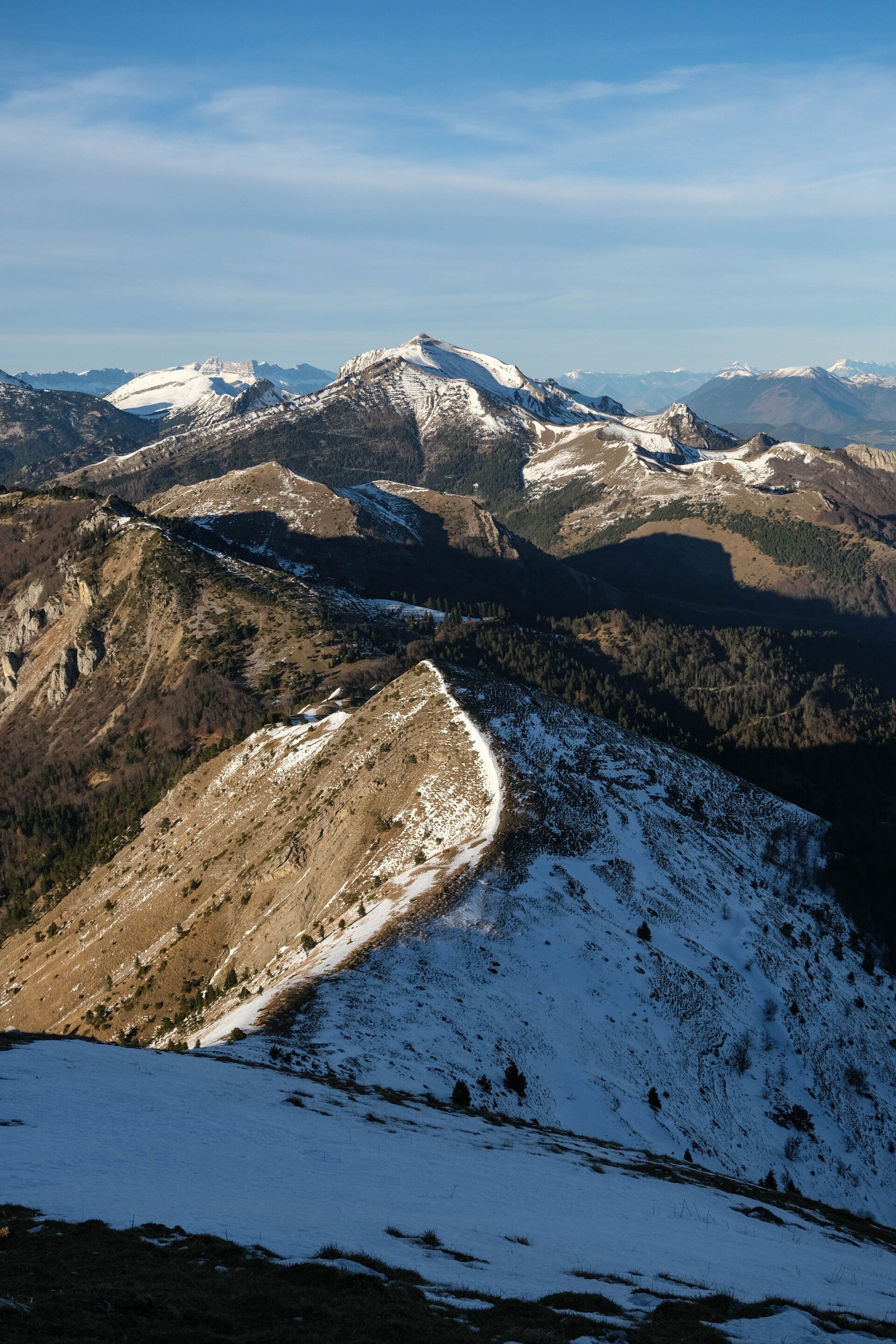 On reste dans les alpages jusqu'à atteindre le point 1686, sorte d'antécime du Quigouret. L'ambiance est particulièrement agréable avec la lumière rasante de ce début décembre et l'absence de vent, le tout avec une visibilité exceptionnelle, le voile nuageux s'étant cantonné bien plus au Nord.