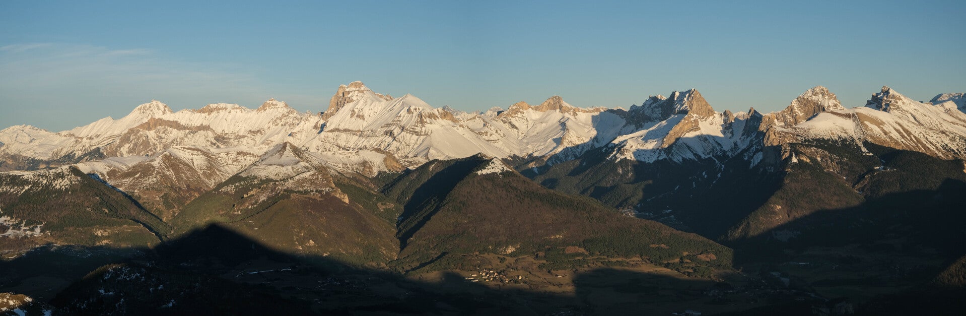 Les changements de luminosité se font de plus en plus marqués sur le Massif du Dévoluy. Alors que les profondes vallées se font happer par les ombres, toutes les cimes sont encore éclairées.