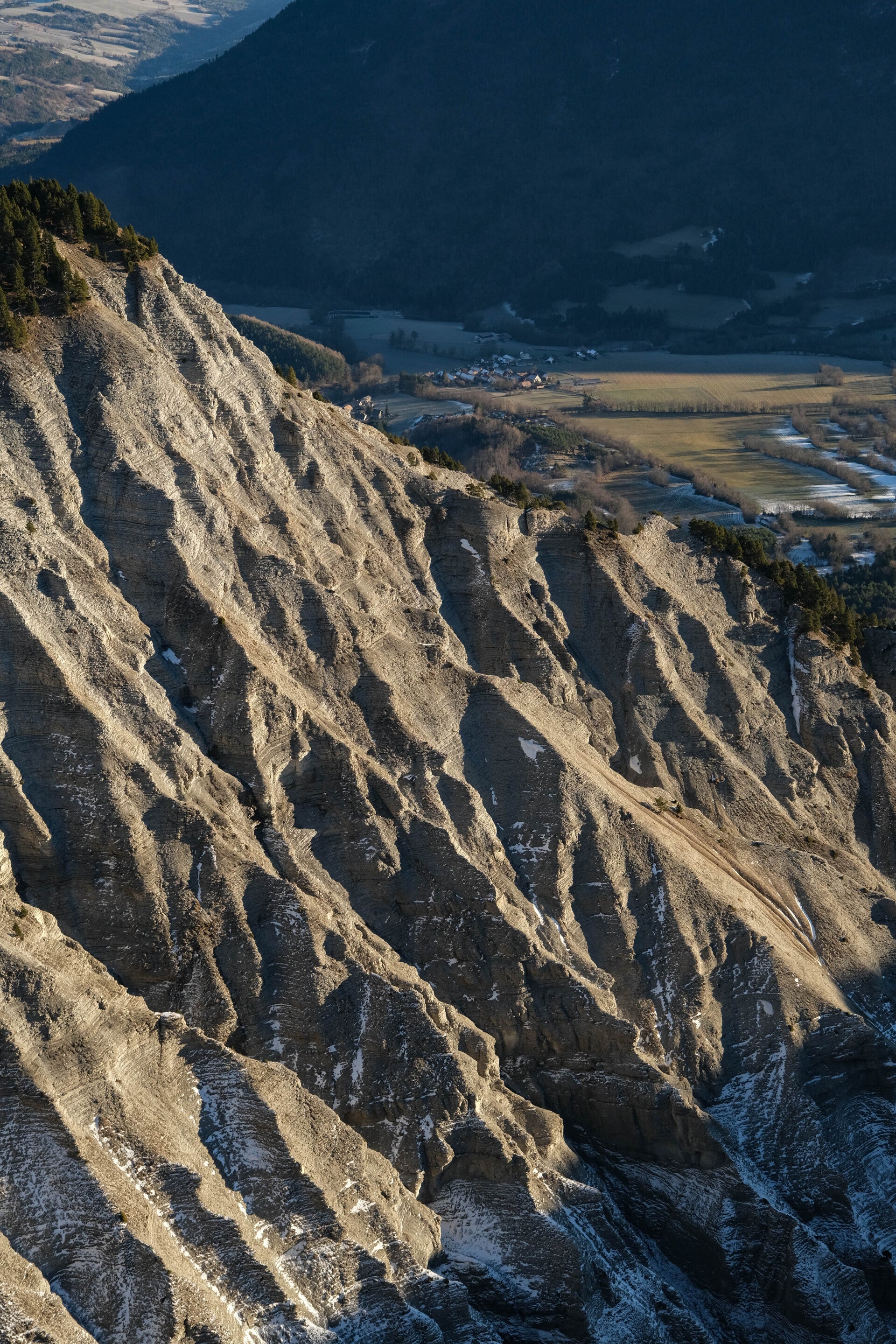 Dévoluy à gauche et Diois à droite. On observe bien la division entre les hautes montagnes du Dévoluy et les reliefs plus vallonés du Diois.