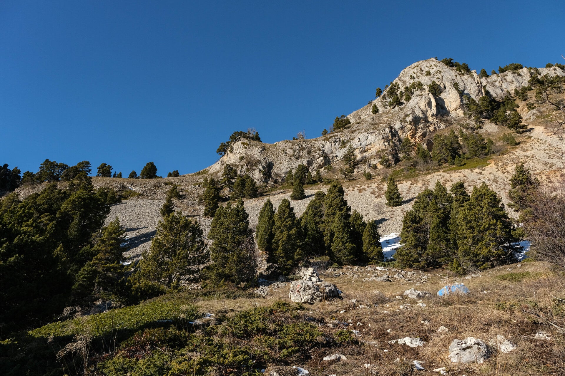 Le Vallon de Combau est désert en cette fin décembre, alors même que sa route d'accès, du fait du faible enneigement, permet encore d'arriver au coeur de la petite vallée drômoise. Au lieu de suivre classiquement son talweg pour pénétrer dans la réserve, on zyeute les quelques pas qui se situent entre Tussac et le Sommet de la Montagnette. Quatre passages peu connus, peu entretenus, probablement d'anciennes voies d'accès ouvertes par les bergers d'antan, permettent de passer en territoire vertacomicorien (d'Ouest en Est) : le Pas des Ampes, le Pas du Pastel, le Pas de la Plane et le Pas du Gris.