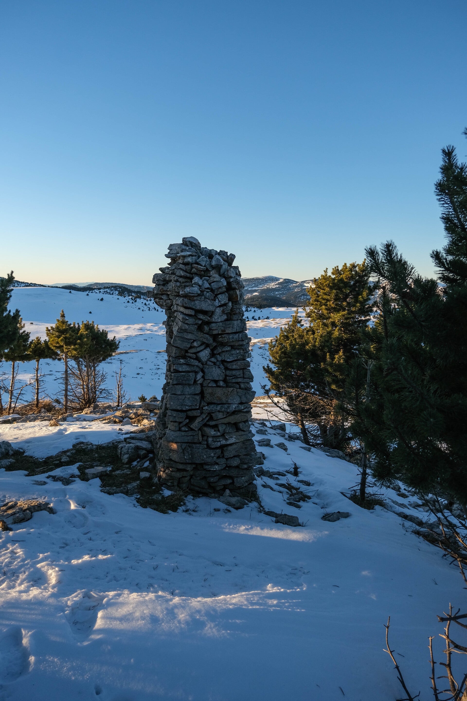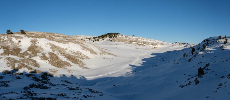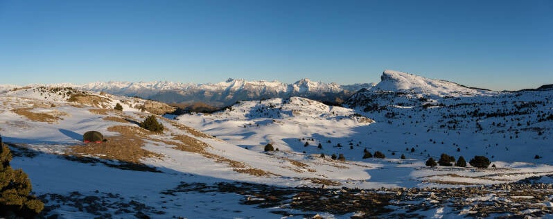 Ces sources et cette couche de neige nous rendent plus libres de nos mouvements quant à l'établissement du bivouac du soir. Nous ne sommes pas obligés d'analyser les cartes topographiques du massif et d'y sélectionner les potentiels lieux pour s'hydrater. On prépare donc notre traversée sur deux jours, d'autant que les randonneurs ont déserté en partie les lieux avec l'arrivée des températures négatives.