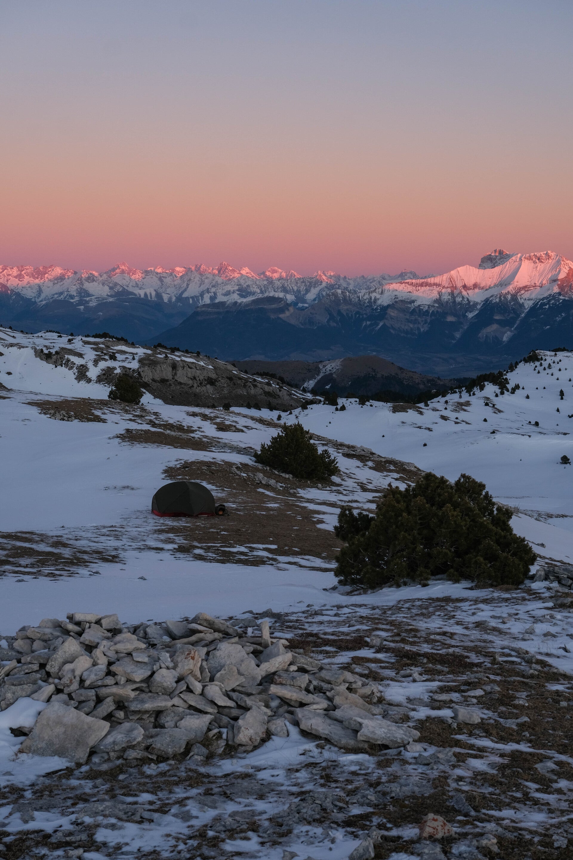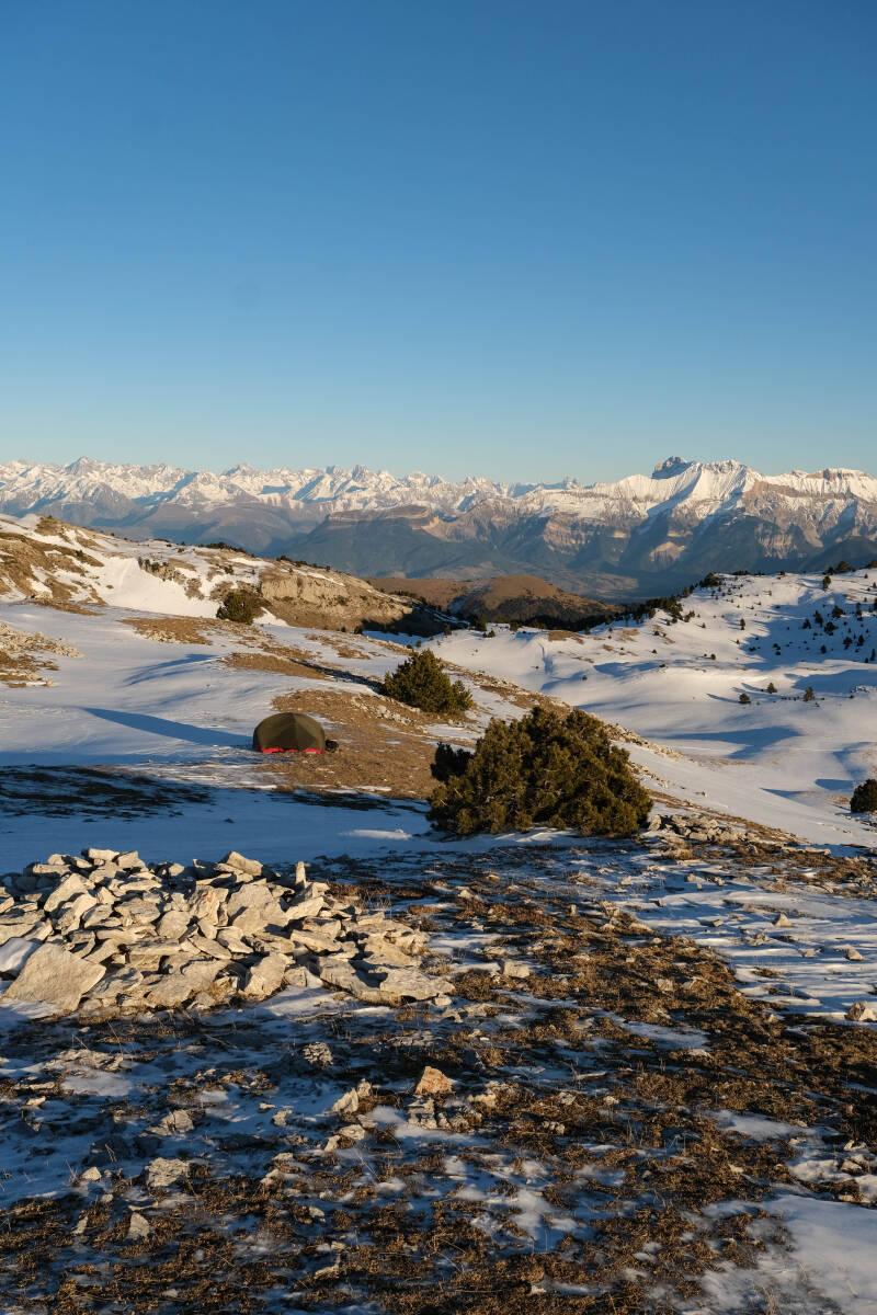 Au Point 1874, une butte battue par les vents et située à mi-chemin entre le Sommet de la Montagnette et Tête Chevalière, on décide d'installer notre bivouac. La vue y est toujours centrale et on pourra profiter des dernières lueurs avant la tombée de la nuit.