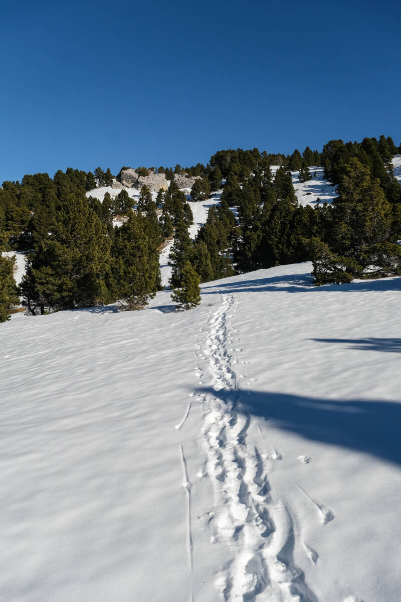 Au Pas du Gris, on met pied dans la réserve. La neige fait une modeste apparition ainsi que quelques traces que l'on suivra fidèlement en direction des hauteurs du vallon. On traverse le Pré Bouzat en prenant bien soin de tourner la tête quelques instants pour apercevoir le Mont Ventoux au loin ainsi que l'extrémité Sud de la Montagne du Glandasse.