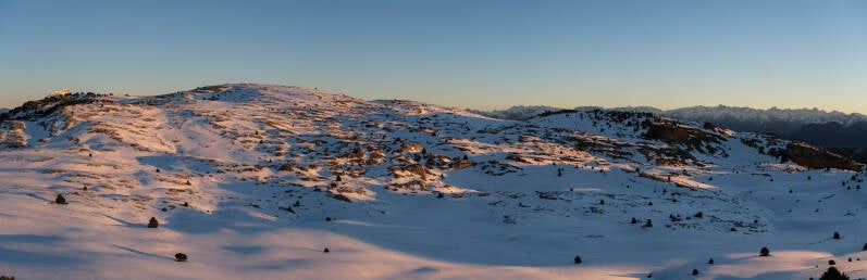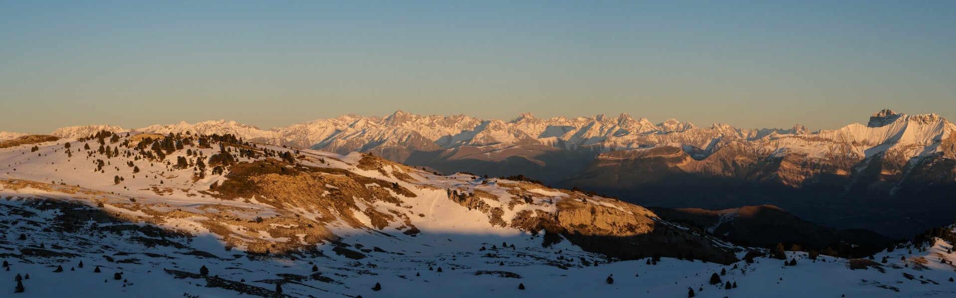 Dans un festival de teintes chaudes, les Ecrins et le Dévoluy rivalisent de beauté en cette fin de journée hivernale. L'absence de vent rend d'autant plus agréable la contemplation. Il ne manquerait plus que quelques caprinés daignent traverser le plateau pour que la carte postale vertacomicorienne soit complète. Mais ce ne sera pas pour ce soir.