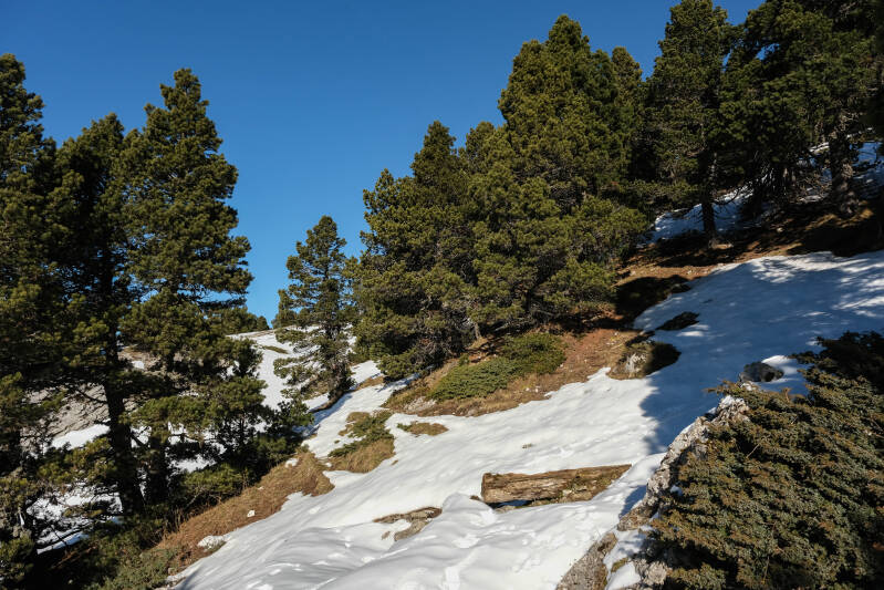 Vers 1600m, on sort de la forêt puis on fait face à la rampe d'accès pour le Pas du Gris (photo de gauche). Le sentier se distingue maintenant très bien et l'absence de neige en face Sud permet un cheminement sans encombre.